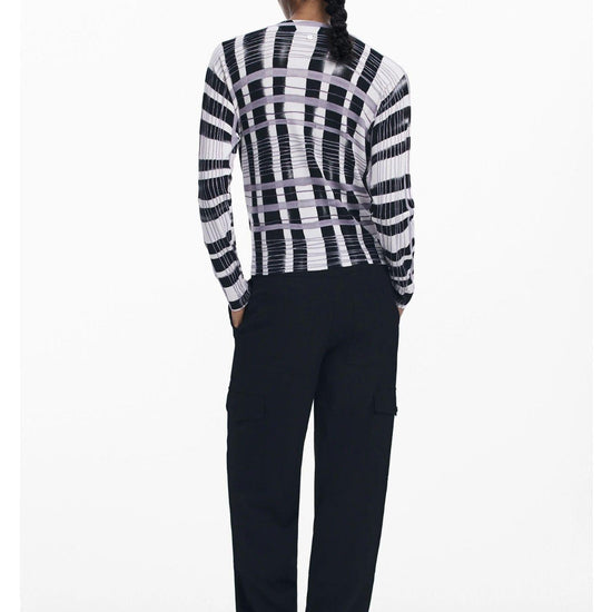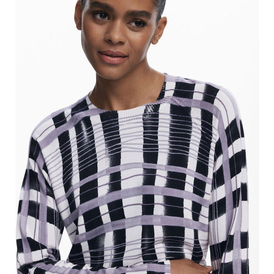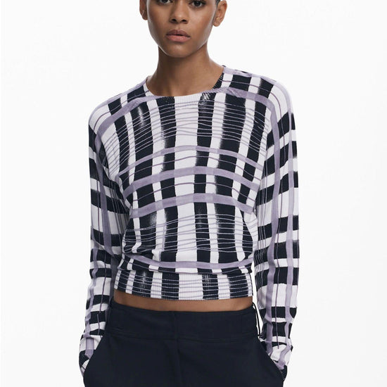 Maglione leggero a maniche lunghe con collo rotondo e stampa a righe stile mikado in versione orizzontale e verticale. Stampa a righe. Fit regular. Collo rotondo. Manica lunga. Tessuto leggero. Collezione AW25. Progettato a Barcellona. Misure modello: altezza 178 cm, vita 59 cm, fianchi 86 cm. Taglia modello: S. Composizione esterna: 80% viscosa, 20% poliammide.