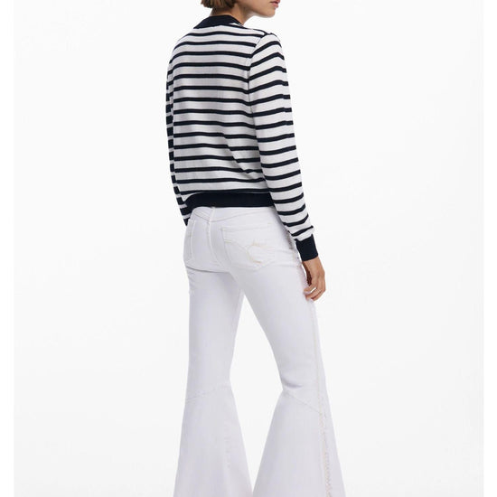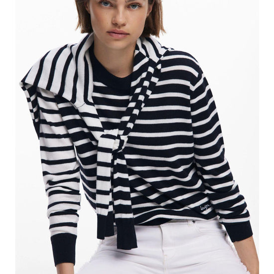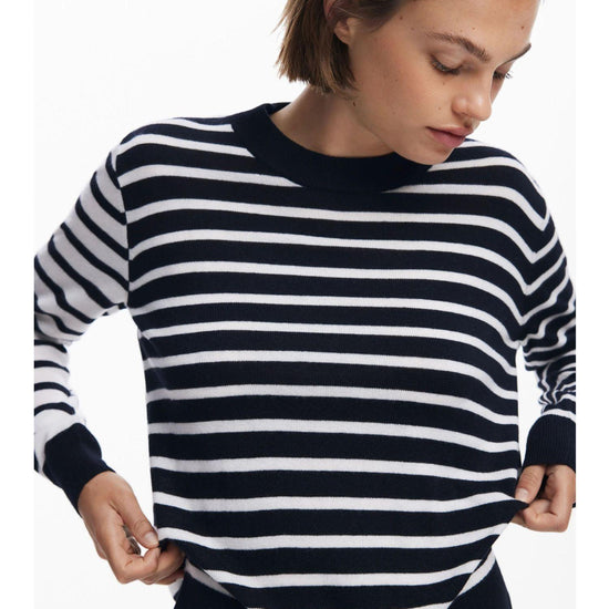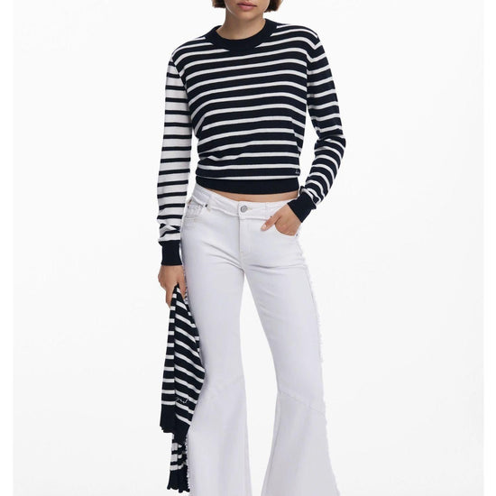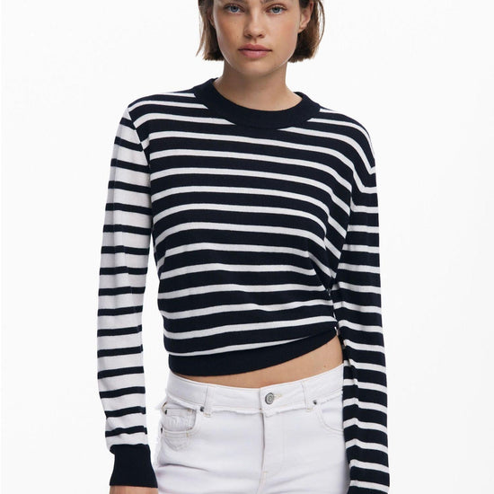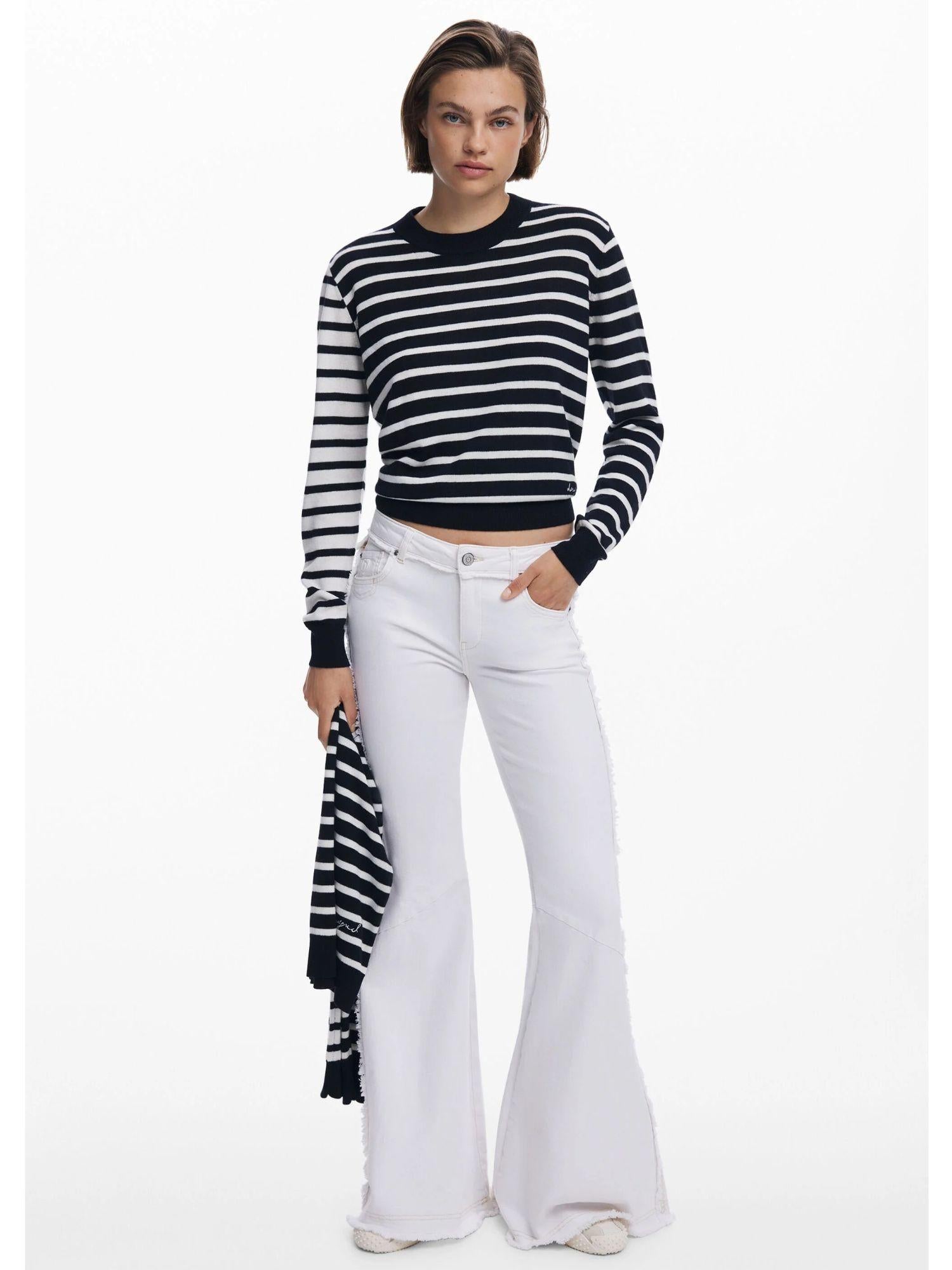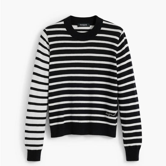 Maglione leggero a maniche lunghe con collo rotondo, stampa a righe orizzontali bicolore e dettaglio di logo ricamato. Stampa a righe. Fit regular. Collo rotondo. Manica lunga. Logo ricamato nella parte inferiore. Stampa bicolore. Collezione AW25. Progettato a Barcellona. Misure modello: altezza 178 cm, vita 60 cm, fianchi 89 cm. Taglia modello: S. Composizione esterna: 45% poliestere, 22% lana, 19% acrilico, 14% poliammide.