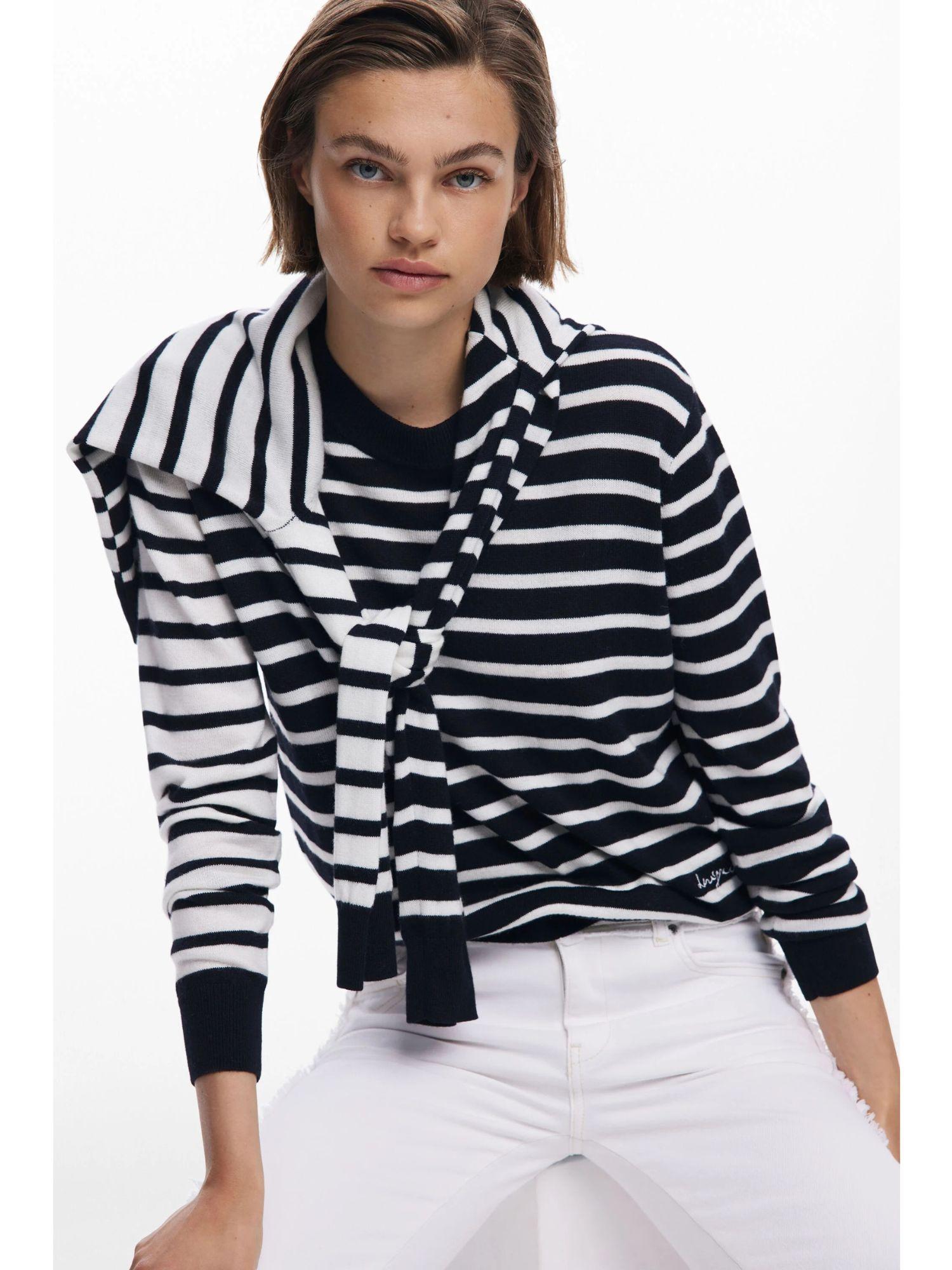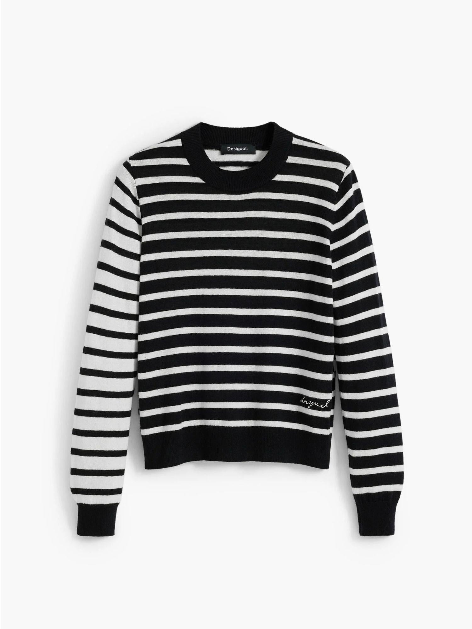 Maglione leggero a maniche lunghe con collo rotondo, stampa a righe orizzontali bicolore e dettaglio di logo ricamato. Stampa a righe. Fit regular. Collo rotondo. Manica lunga. Logo ricamato nella parte inferiore. Stampa bicolore. Collezione AW25. Progettato a Barcellona. Misure modello: altezza 178 cm, vita 60 cm, fianchi 89 cm. Taglia modello: S. Composizione esterna: 45% poliestere, 22% lana, 19% acrilico, 14% poliammide.