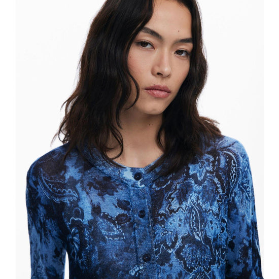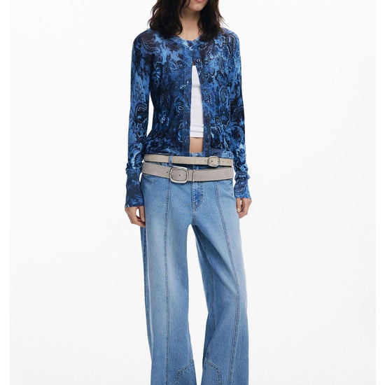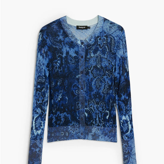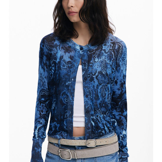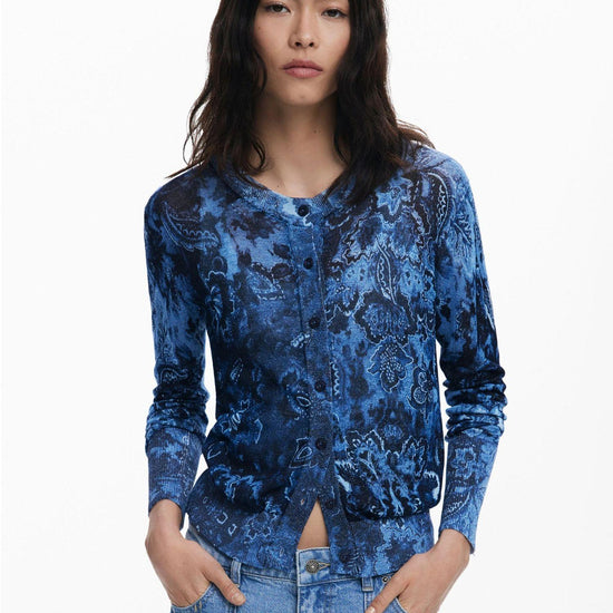 Cardigan sottile aderente con abbottonatura frontale e scollo rotondo in tessuto con finitura lucida. Stampa arty. Vestibilità slim. Collo rotondo. Manica lunga. Chiusura con bottone. Finitura lucida. Tessuto aderente. Collezione AW25. Progettato a Barcellona. Misure modello: altezza 177 cm, vita 61 cm, fianchi 87 cm. Taglia modello: S. Composizione esterna: 86% viscosa, 10% poliammide, 4% metallised fiber.