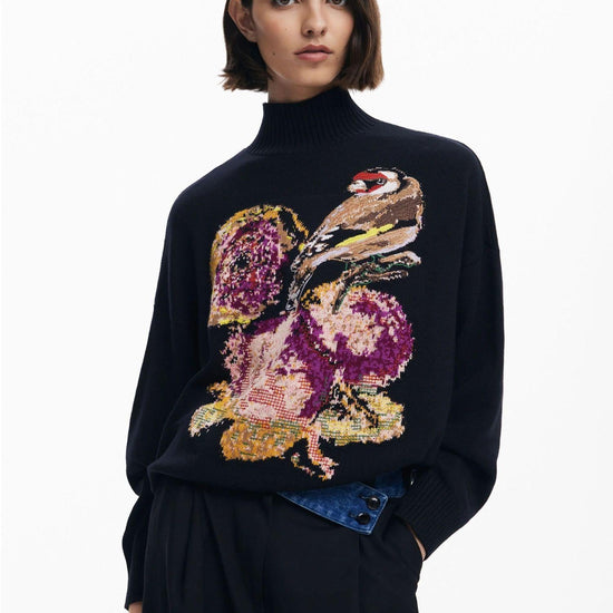 Maglione jacquard a collo alto con stampa floreale e uccello disegnata da Monsieur Christian Lacroix. Fit regular. Collo dolcevita. Manica lunga. Stampa firmata da Monsieur Christian Lacroix. Realizzato con materiali sostenibili. Collezione AW25. Capsula Exceptionelle disegnata da Mr. Christian Lacroix. Progettato a Barcellona. Acrilico riciclato. Misure modello: altezza 175 cm, vita 60 cm, fianchi 85 cm. Taglia modello: M.