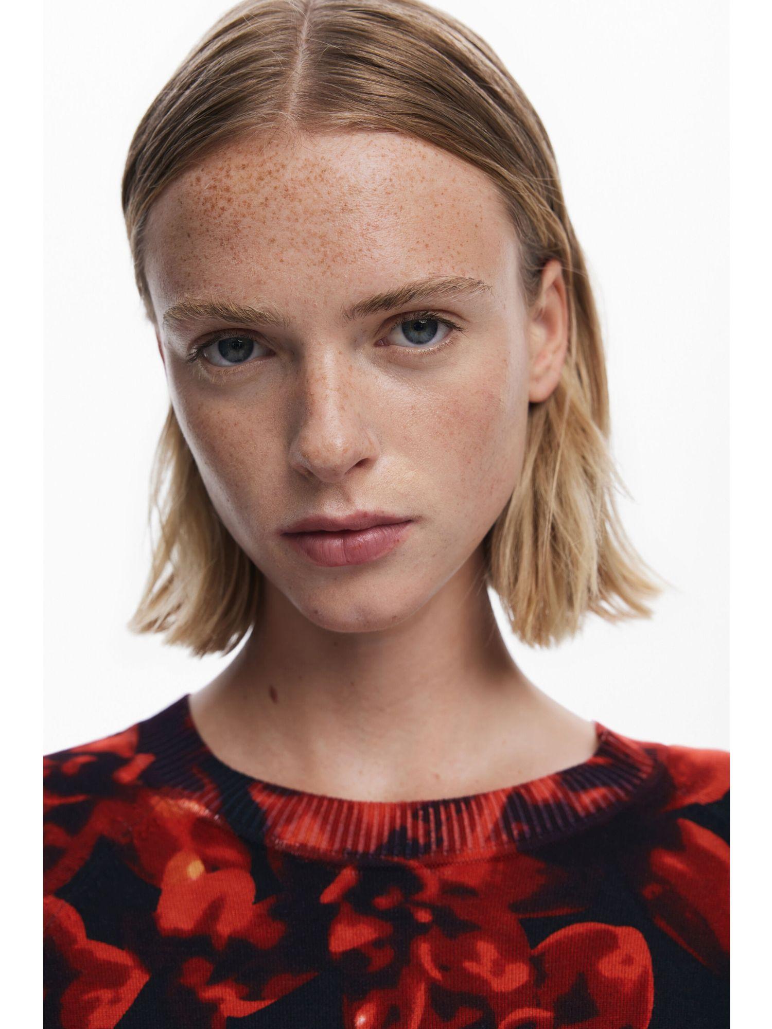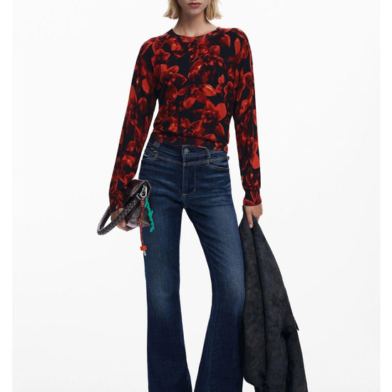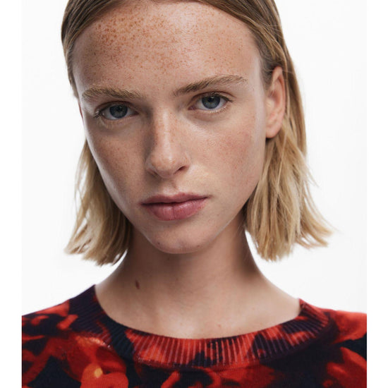 Maglione leggero a taglio regolare con manica lunga, collo rotondo e stampa floreale in tonalità aranciate. Stampa floreale. Fit regular. Collo rotondo. Manica lunga. Tessuto leggero. Toni arancioni. Collezione AW25. Progettato a Barcellona. Misure modello: altezza 175 cm, vita 59 cm, fianchi 87 cm. Taglia modello: S. Composizione esterna: 80% viscosa, 20% poliammide.
