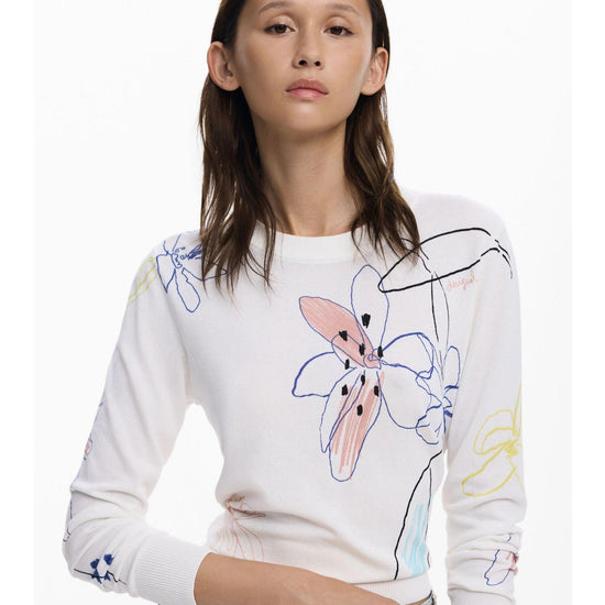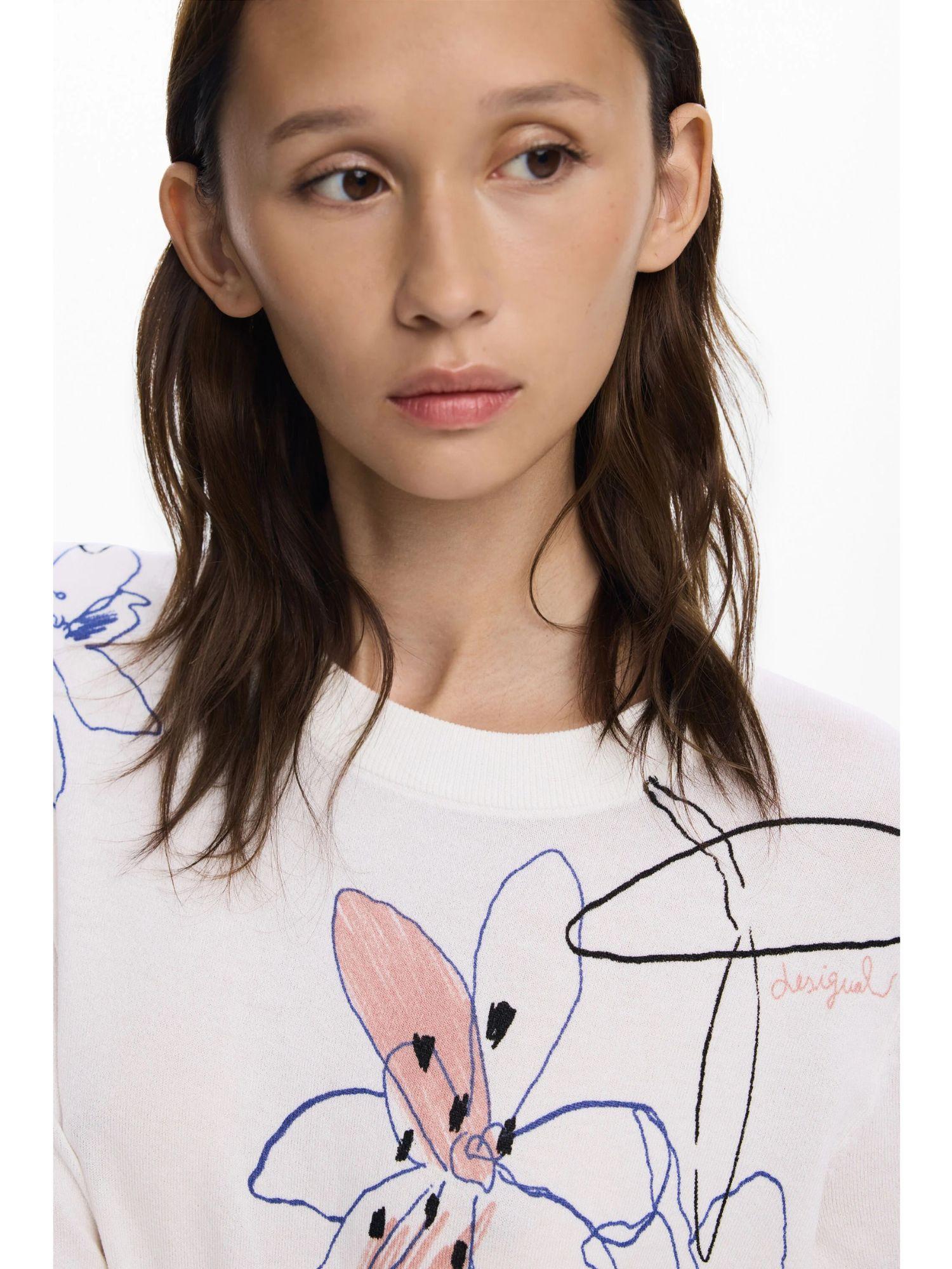 Maglione leggero a taglio regolare con scollo rotondo, maniche lunghe e stampa di tratti floreali. Stampa floreale. Vestibilità comoda. Collo rotondo. Manica lunga. Stampa con tratti di fiori. Tessuto leggero. Collezione AW25. Progettato a Barcellona. Misure modello: altezza 180 cm, vita 62 cm, fianchi 90 cm. Taglia modello: M. Composizione esterna: 61% viscosa, 39% poliammide.
