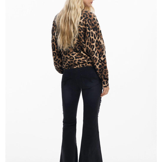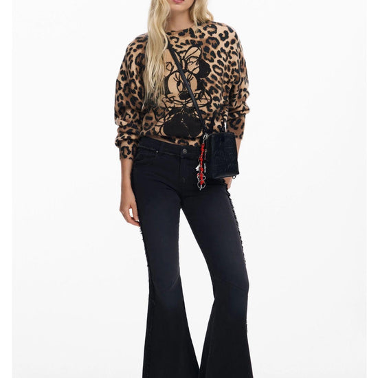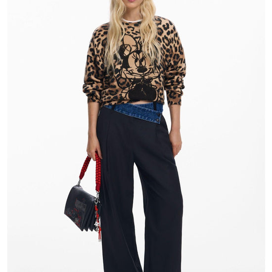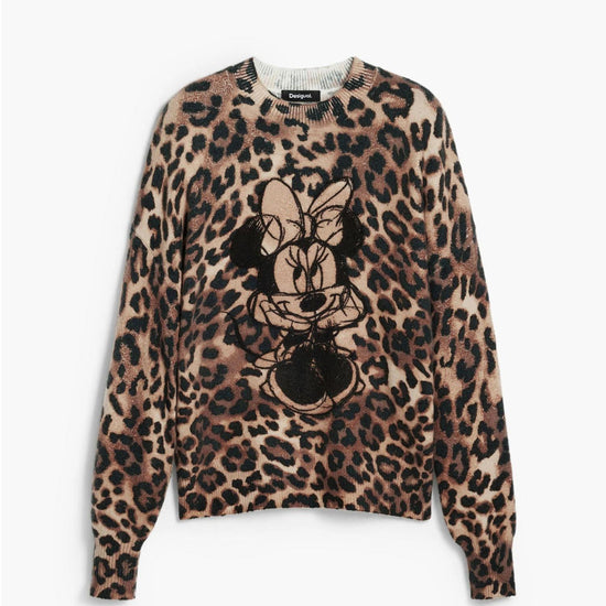 Maglione leggero a maniche lunghe con collo rotondo, stampa animalier e ricamo di Minnie Mouse sul davanti. Stampa animalier. Fit regular. Collo rotondo. Manica lunga. Dettagli ricamati. Illustrazione Minnie Mouse. Collezione AW25. Licenza Disney. Misure modello: altezza 179 cm, vita 59 cm, fianchi 88 cm. Taglia modello: M. Composizione esterna: 63% acrilico, 33% poliammide, 4% elastan.