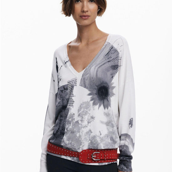 Maglione leggero a taglio rilassato con manica lunga e scollo a V, decorato con stampa fotografica in stile collage. Stampa arty. Vestibilità ampia. Collo a V. Manica lunga. Tessuto leggero. Stampa collage. Collezione AW25. Progettato a Barcellona. Misure modello: altezza 180 cm, vita 62 cm, fianchi 90 cm. Taglia modello: M. Composizione esterna: 80% viscosa, 20% poliammide.