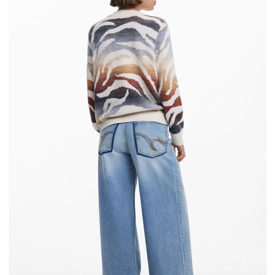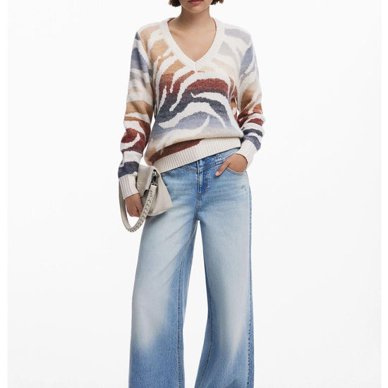 Maglione jacquard a maniche lunghe con scollo a V e stampa a colori sfumati a righe stile zebra. Stampa arty. Fit regular. Collo a V. Manica lunga. Stampa a colori sfumati. Tessuto jacquard. Collezione AW25. Progettato a Barcellona. Misure modello: altezza 178 cm, vita 60 cm, fianchi 89 cm. Taglia modello: M. Composizione esterna: 61% acrilico, 39% poliammide.