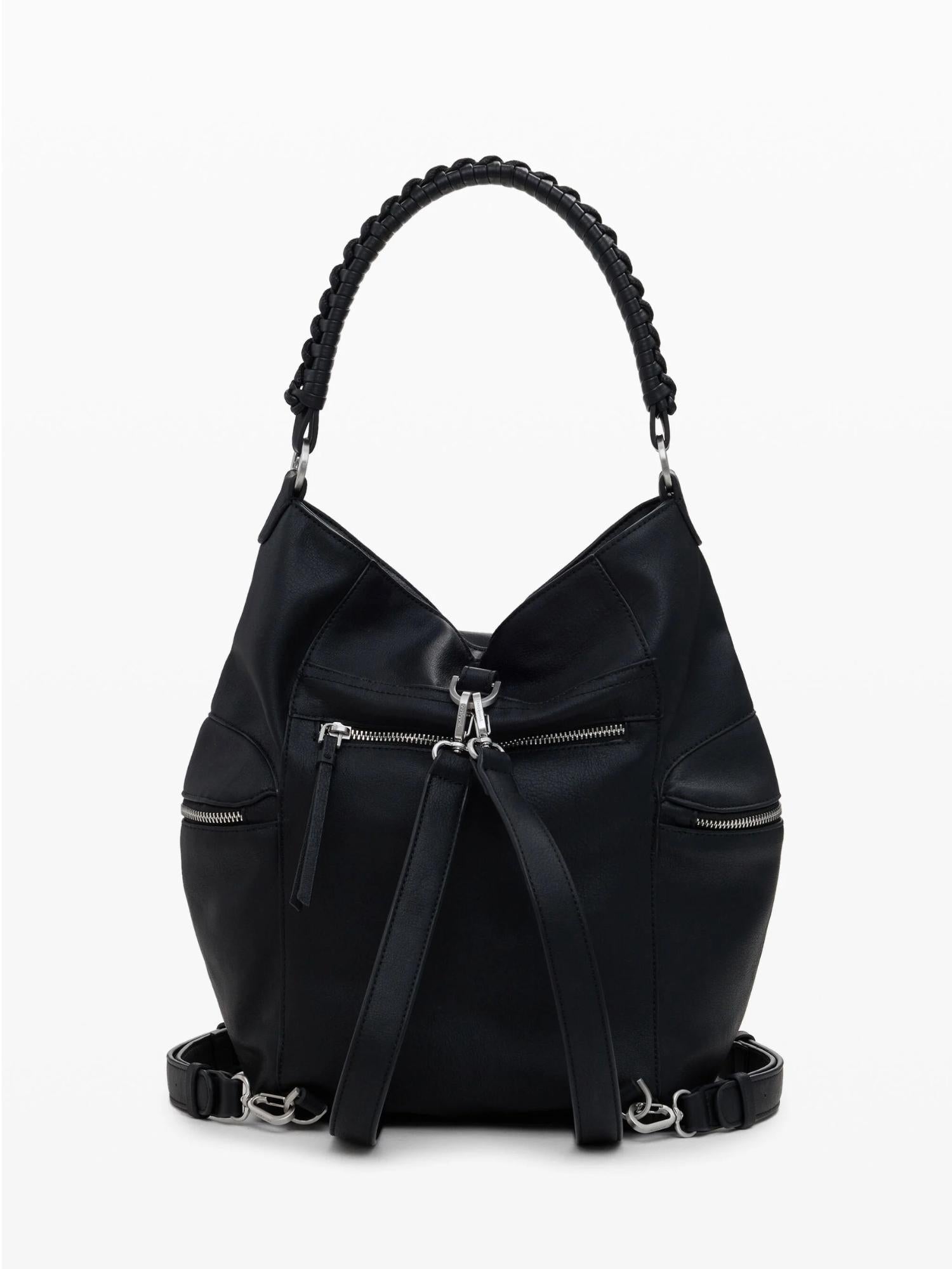 Zaino grande effetto pelle, con logo effetto 3D, chiusura con cerniera e manici rimovibili convertibili in borsa. Logo effetto 3D. Tasche laterali. Tasca posteriore esterna. Chiusura: con cerniera. Spallacci rimovibili dello zaino. Manico rimovibile tipo borsa. Combinazione di colori. Capacità: 13,08 l. Effetto pelle. Progettato a Barcellona. Misure: 25,60 x 14,60 x 12 cm. Composizione esterna: 100% POLIURETANO. Composizione interna: 100% POLIESTERE. Trimming fabric Material: 100% POLIURETANO