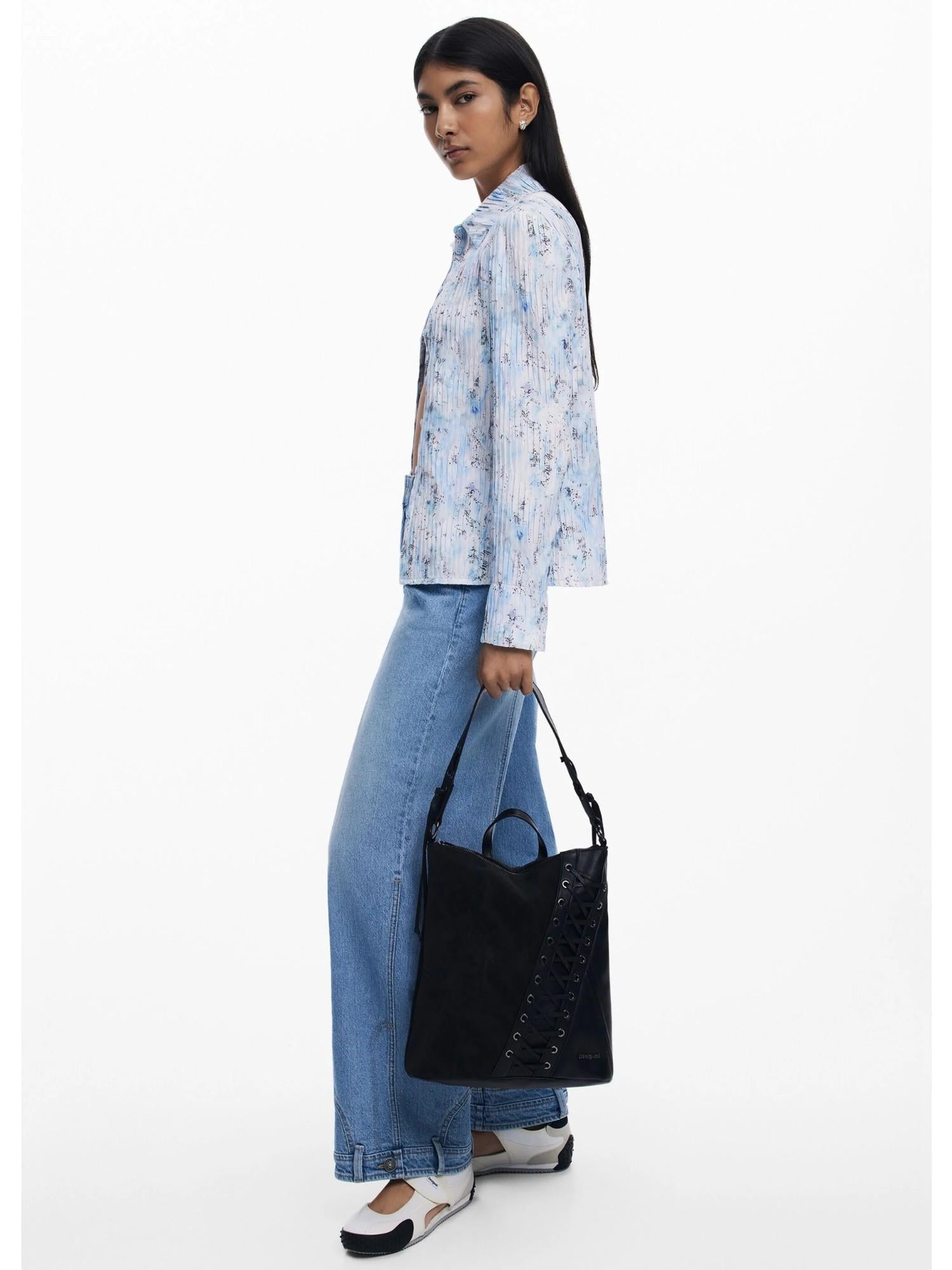 Zaino piccolo in effetto pelle, con dettaglio intrecciato effetto corsetto sulla parte anteriore e manico rimovibile per portare come borsa. Dettaglio intrecciato. Dettagli con occhielli metallici. Tasca posteriore esterna. Chiusura: con cerniera. Tasca interna con cerniera. Manico rimovibile tipo borsa. Effetto corsetto. Scomparto interno. Effetto pelle. Progettato a Barcellona. Misure: 30 x 10 x 30 cm. Composizione esterna: 100% POLIURETANO. Composizione interna: 100% POLIESTERE. Trimming fabric Material: 100% POLIURETANO.