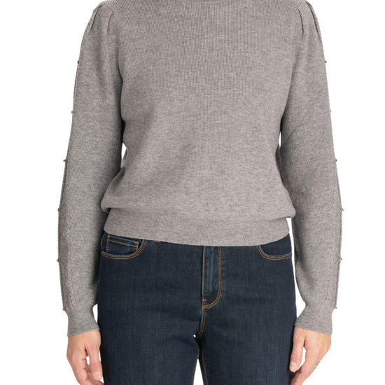 Maglia donna a costine con collo a lupetto, bordi a costine su sine manica girovita e colletto, applicazioni su maniche