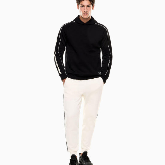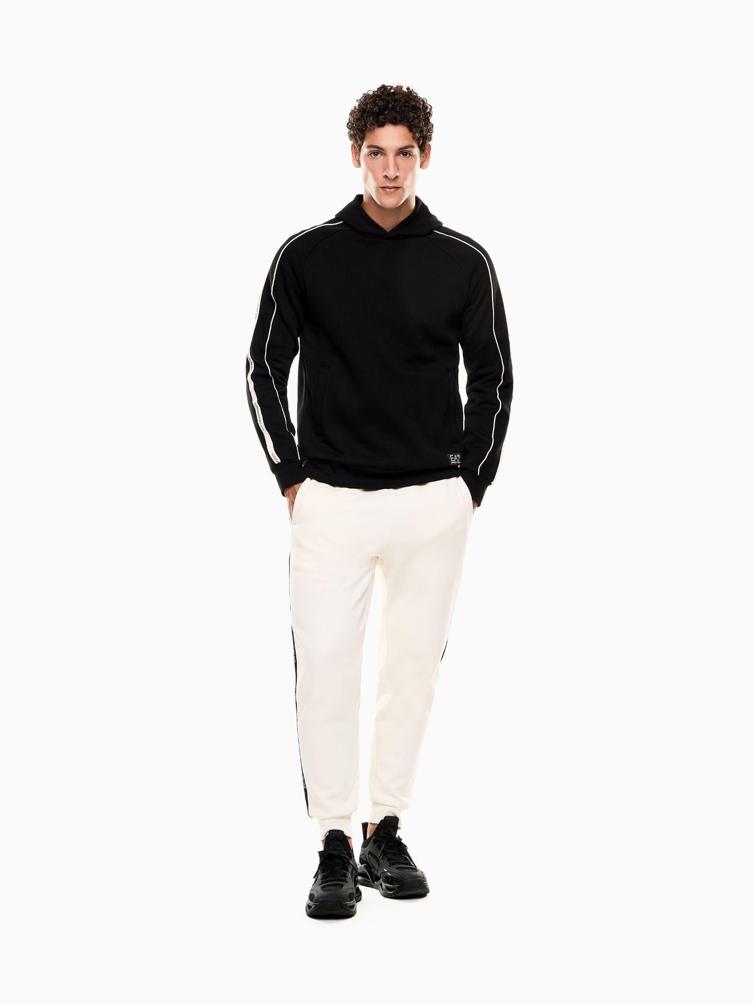 Felpa con cappuccio realizzata in morbido misto cotone, caratterizzata da una vestibilità regular che unisce comfort e stile. Il design è impreziosito dal dettaglio con logo tape sulle spalle e dal logo EA7 a contrasto sul petto, elementi iconici della linea Logo Series. Dotata di pratiche tasche laterali, questa felpa è perfetta per completare look sportivi o per i momenti di relax. Tessuto: 85% cotone, 15% poliestere. Dettagli in maglia: 96% cotone, 4% elastan. Fettuccia: 100% cotone. Fodera cappuccio: 100% cotone. Vestibilità regular. Cappuccio. Due tasche oblique. Logo EA7 a contrasto. Dettaglio logo tape sulle spalle.