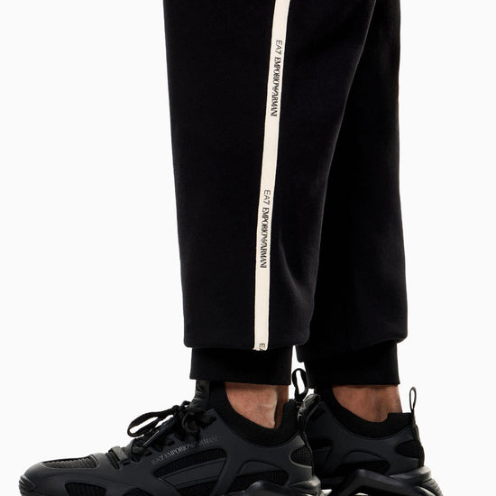 Pantaloni jogger realizzati in morbido misto cotone, caratterizzati da una vestibilità regular che assicura comfort e libertà di movimento. Il modello presenta vita elasticizzata con coulisse regolabile, tasche laterali e dettagli distintivi come il logo EA7 a contrasto e la fascia logo tape sui lati, elementi iconici della linea Logo Series. Una proposta dal look sportivo e contemporaneo, perfetta per i momenti di relax e il tempo libero. Tessuto: 85% cotone, 15% poliestere. Dettagli in maglia: 96% cotone, 4% elastan. Fettuccia: 100% cotone. Vestibilità regular. Elastico in vita con coulisse. Due tasche laterali. Logo EA7 a contrasto. Dettaglio logo tape.