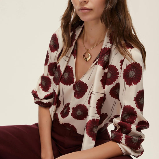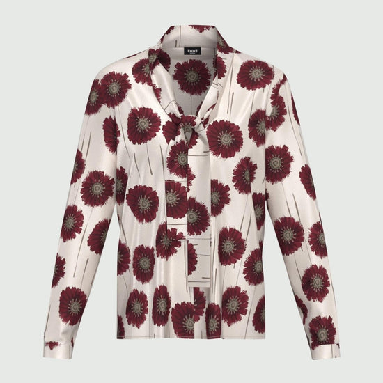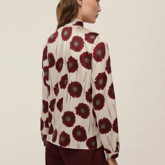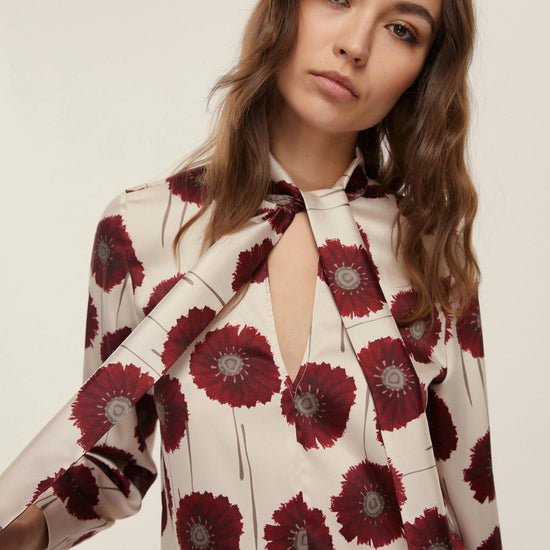 Blusa in morbido twill decorato da macro stampa floreale. Luminosa e leggera, si stringe al collo con la sciarpina e crea un immediato flair femminile. Da giocare a contrasto con biker jacket in pelle. Tessuto principale contenente una percentuale di poliestere riciclato superiore al 50%. Camicia in twill tecnico stampato. Fit dritto. Scollo a V con sciarpina da annodare. Maniche lunghe con polso e bottone. Composizione e lavaggio: In lavatrice max 30 gradi ridotta azione meccanica; non candeggiare; non asciugare in tamburo; asciugare appeso in ombra; ferro tiepido max 120 gradi c; lavare a secco delicato con percloroetilene. 100% poliestere.