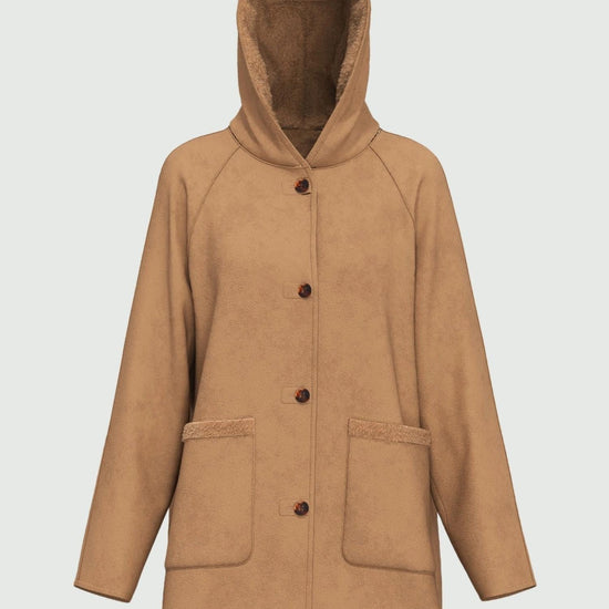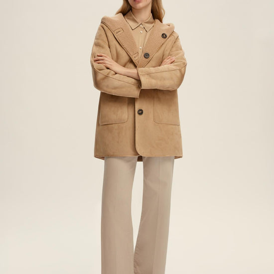 Doppia identità, stesso spirito disinvolto. Il caban reversibile accompagna i movimenti con leggerezza e comfort. Da indossare come un abbraccio urbano, tra passeggiate in città e fughe last minute. Caban reversibile in jersey dal finish vellutato accoppiato con tessuto in materiale morbido. Fit dritto. Collo con cappuccio e maniche raglan. Chiusura monopetto con bottoni a vista. Tasche laterali applicate su un lato e inserite sull'altro. Composizione e lavaggio: Non lavare in acqua; non candeggiare; non asciugare in tamburo; non stirare; lavare a secco delicato con percloroetilene; non lavare ad umido professionale.; lavare il capo allacciato. Tessuto esterno 100% poliestere; tessuto interno 100% poliestere.