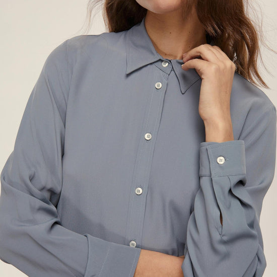 Nuova edizione della classica camicia femminile, in preziosa crêpe de Chine di misto seta. Essenziale nelle linee, ha tutta la versatilità che serve per accompagnarti dall'ufficio all'aperitivo. Tessuto principale contenente materie prime derivanti dalla cellulosa del legno, fibra ricavata nel rispetto del patrimonio forestale. Camicia in crêpe de Chine di misto seta. Vestibilità dritta, collo a camicia con abbottonatura a vista, maniche lunghe con bottoni al polso. Tessuto: 69% Acetato, 31% Seta