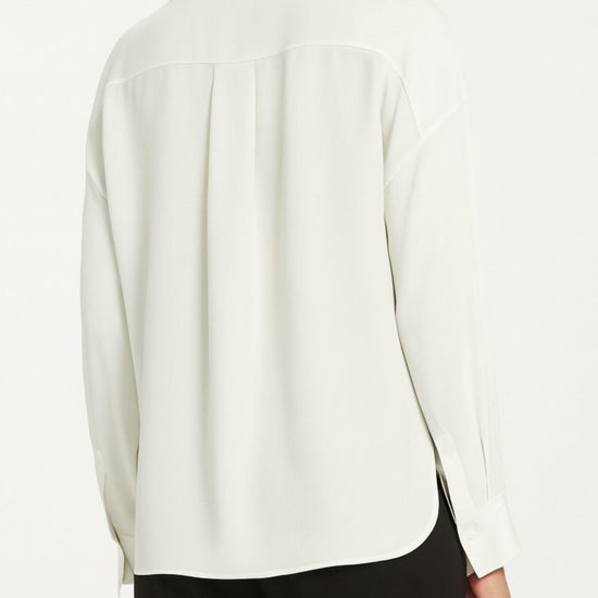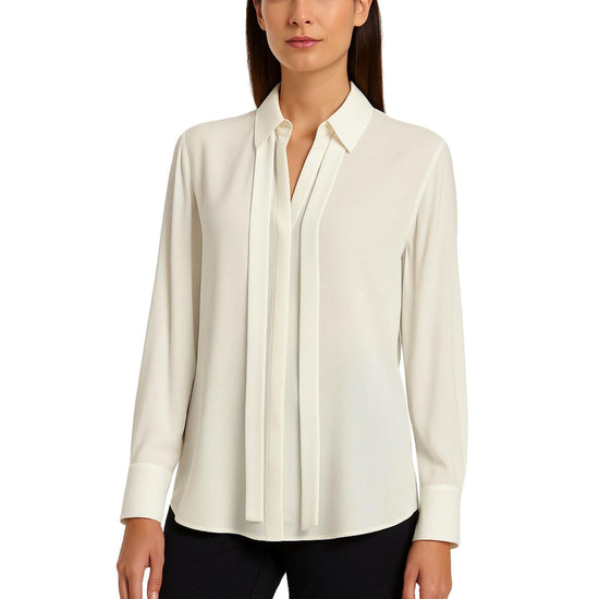 Blusa in raso martellato lavato dal fascino raffinato e contemporaneo. Le linee pulite e il fit dritto valorizzano la lucentezza del tessuto, mentre il collo a camicia con motivo di nastrino aggiunge un dettaglio elegante e femminile. Il retro con carré e cannoncino e il fondo stondato completano il design sofisticato, perfetto sia per look formali che casual chic. Fit dritto. Collo a camicia con motivo di nastrino. Retro con carré e cannoncino. Fondo stondato. Tessuto: 100% poliestere.