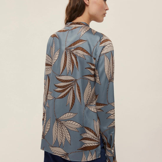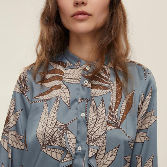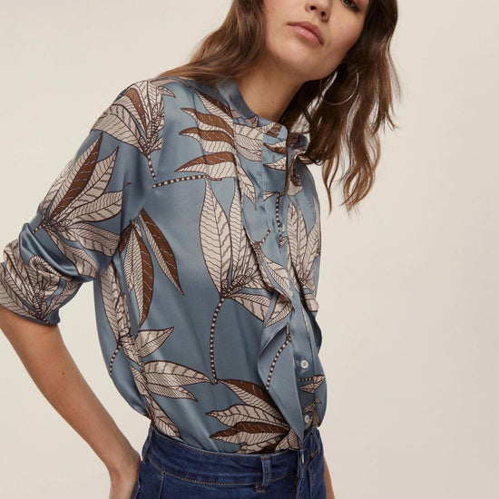 Ampi foliage e il tocco romantico dei volant sul davanti trasformano questa camicia in un nuovo must di stagione. Perfetta sotto un impermeabile e con i denim. Tessuto principale contenente una percentuale di poliestere riciclato superiore al 50%. Camicia in tessuto tecnico stampato. Fit dritto. Collo alla coreana con abbottonatura a vista. Motivo di piccoli volant sul davanti. Polso con bottone e piccolo sbuffo. Composizione e lavaggio: In lavatrice max 30 gradi ridotta azione meccanica; non candeggiare; non asciugare in tamburo; asciugare appeso in ombra; ferro tiepido max 120 gradi c; lavare a secco delicato con percloroetilene. 100% poliestere.