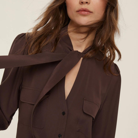 Con la sciarpina da annodare al collo e le tasche al petto, questa camicia mixa allure casual con note più femminili. Perfetta in ufficio con balzer e pants sartoriali, diventa sofisticata con una gonna a tubino e slingback. Camicia in crêpe de Chine di misto seta. Fit leggermente sfiancato. Scollo a V con sciarpina da annodare sul davanti. Abbottonatura a vista. Motivo di arricci sulla parte alta del giro manica. Fondo dritto stondato. Composizione e lavaggio: Lavare a mano acqua fredda max 40°; non candeggiare; non asciugare in tamburo; asciugare appeso in ombra; ferro tiepido max 120 gradi c; lavare a secco delicato con percloroetilene; non lavare ad umido professionale. 69% acetato, 31% seta.