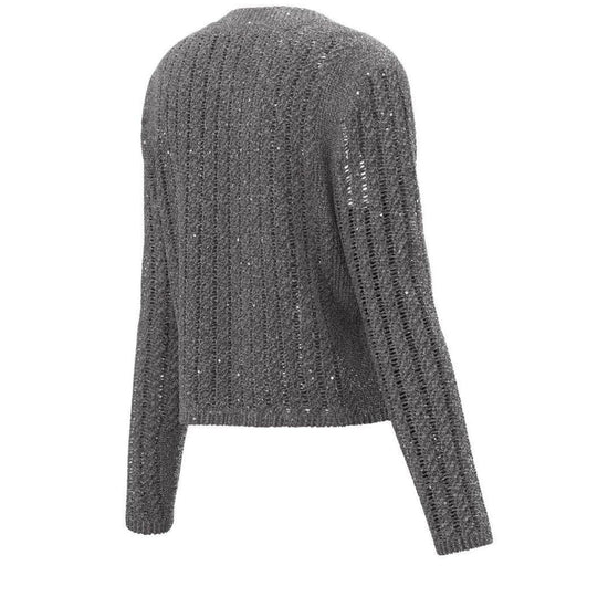 Cardigan in maglia di misto viscosa, lana e cashmere con paillette. Fit dritto, scollo stondato, chiusura con uncino dorato, bordi rifiniti con costine. Filato in maglia 35% Poliestere, 26% Lana, 16% Poliammide, 16% Viscosa, 7% Cashmere. Decorazioni escluse
