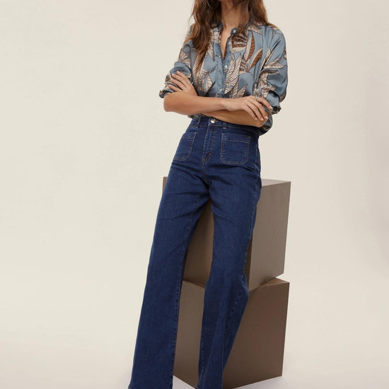Con le tasche squadrate applicate sul davanti, i jeans dritti ci regalano un pizzico di coolness anni '70. Da completare con blusa colorata e parka corti per una primavera all'insegna della leggerezza. Jeans in denim di cotone stretch. Fit dritto. Chiusura con bottone personalizzato. Ricamo Emmergram sulla tasca posteriore. Tasche squadrate applicate sul fronte e sul retro. Etichetta posteriore personalizzata. Tessuto: 98% Cotone, 2% Elastan.