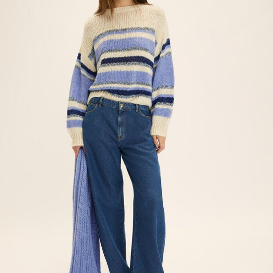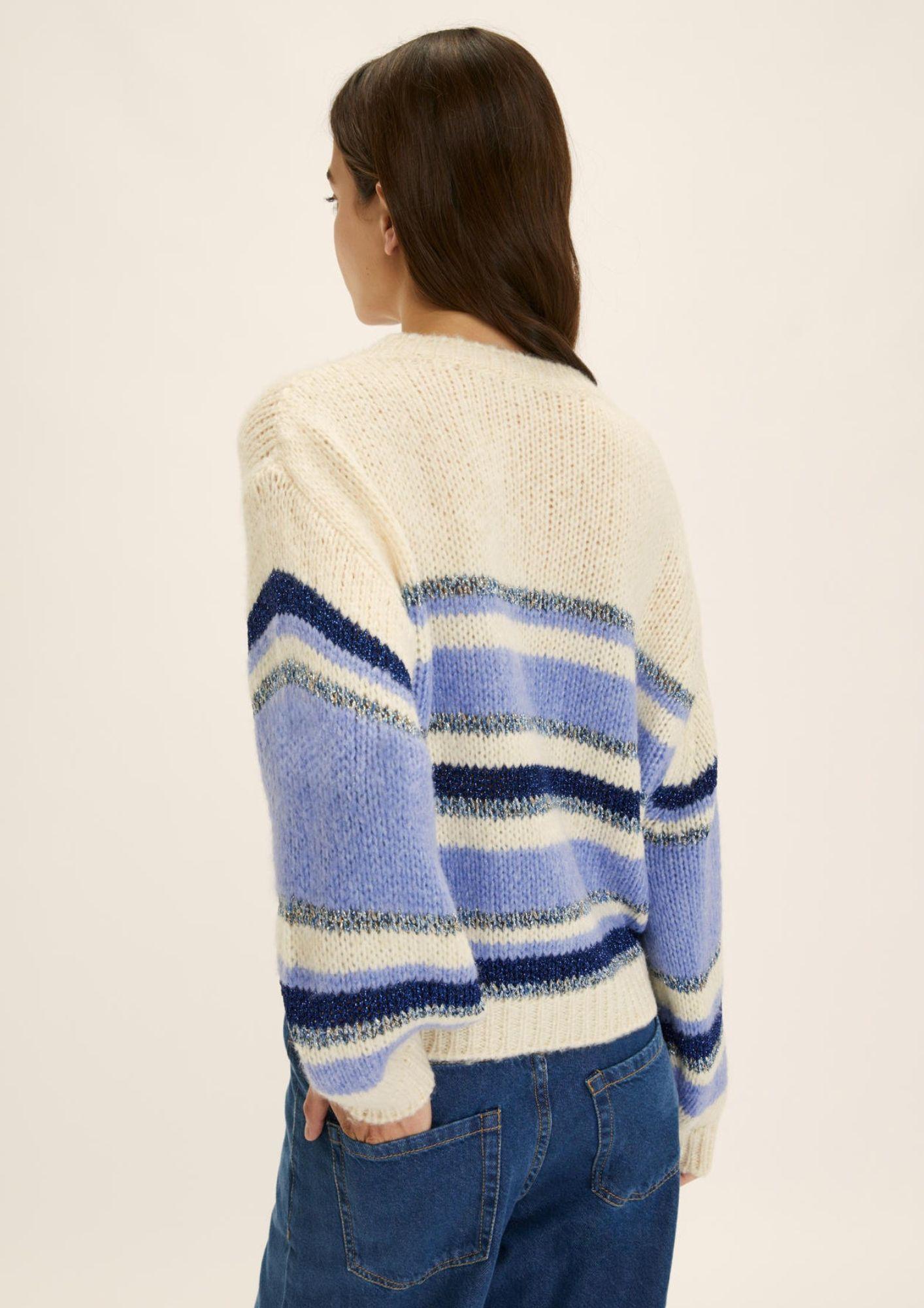 Maglia over in filato misto lana fluffy con scollo tondo, giro sceso e manica lunga e morbida; lavorazione a righe con intervento lurex. Lunghezza: cm 53 Filato in maglia 1: 52% Poliestere, 38% Acrilica, 5% Lana, 5% Viscosa Filato in maglia 2: 80% Viscosa, 20% Fibra metallizzata