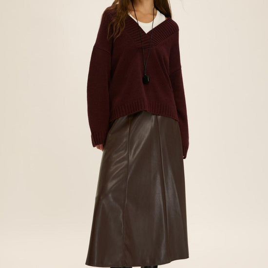 Maglia over in filato misto lana con scollo a V profondo finito con costa alta, giro sceso e manica lunga. Lunghezza: cm 61 Filato in maglia: 75% Acrilica, 10% Lana, 10% Viscosa, 5% Alpaca