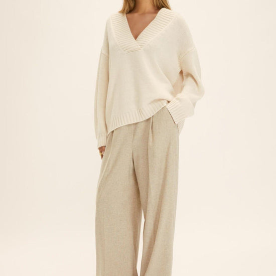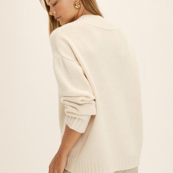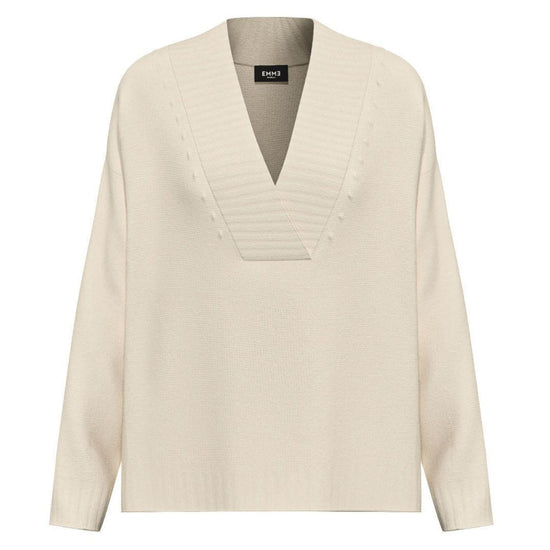 Maglia over in filato misto lana con scollo a V profondo finito con costa alta, giro sceso e manica lunga. Lunghezza: cm 61 Filato in maglia: 75% Acrilica, 10% Lana, 10% Viscosa, 5% Alpaca