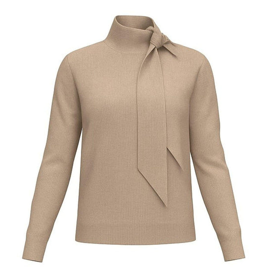 Scollo stondato con sciarpa unita, polsi e fondo capo con costine. Filato in maglia: 70% Viscosa, 30% Poliammide
