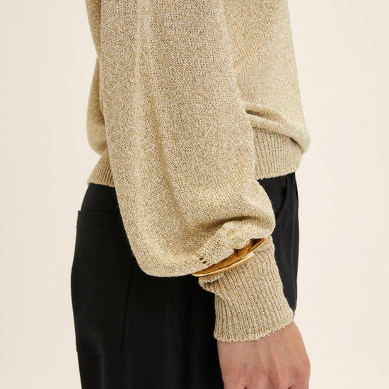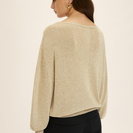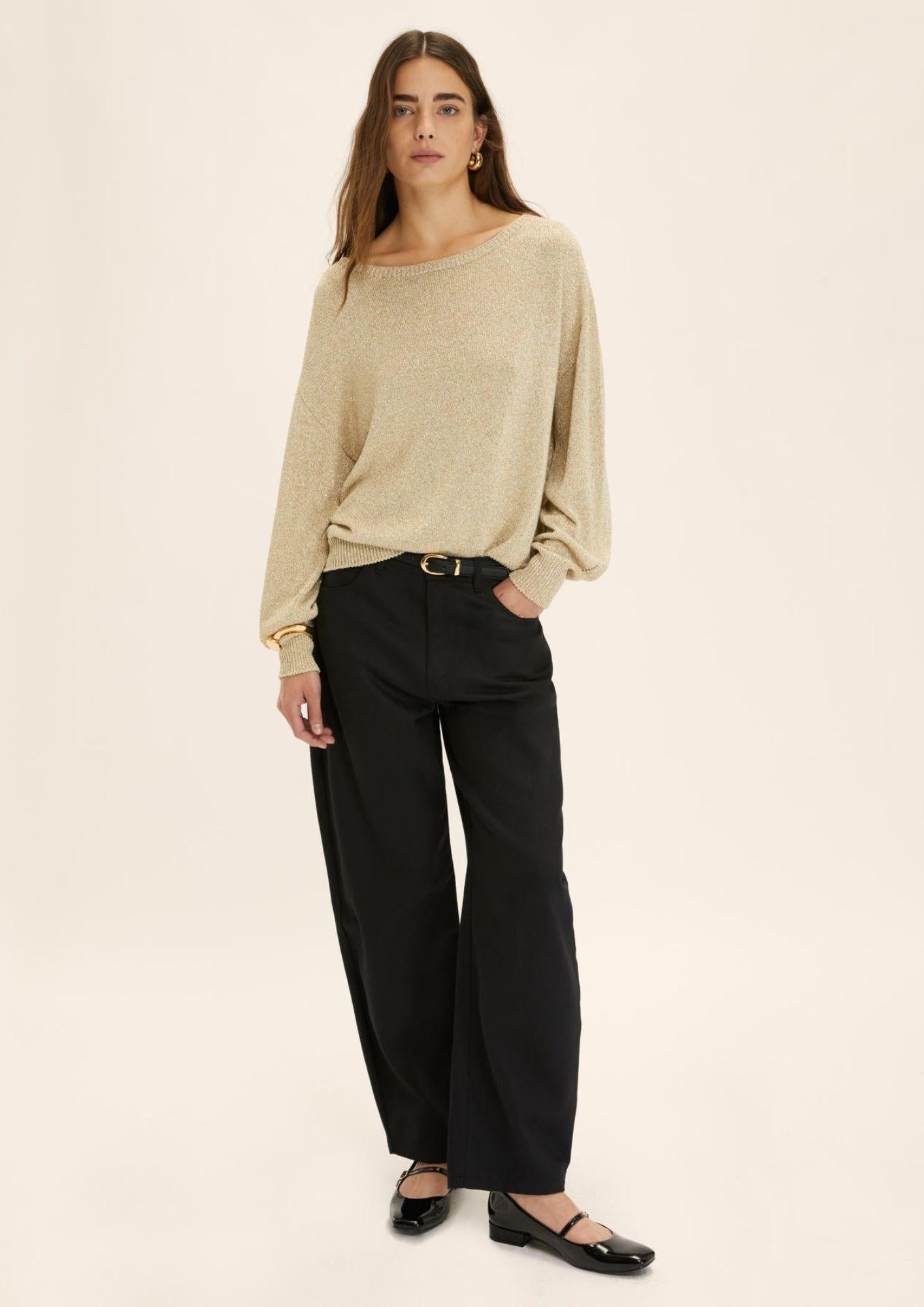 Maglia in filato lurex dal fit morbido con scollo leggermente a barca, giro sceso e manica lunga a sbuffo. Lunghezza: cm 54 Filato in maglia: 80% Viscosa, 20% Fibra metallizzata