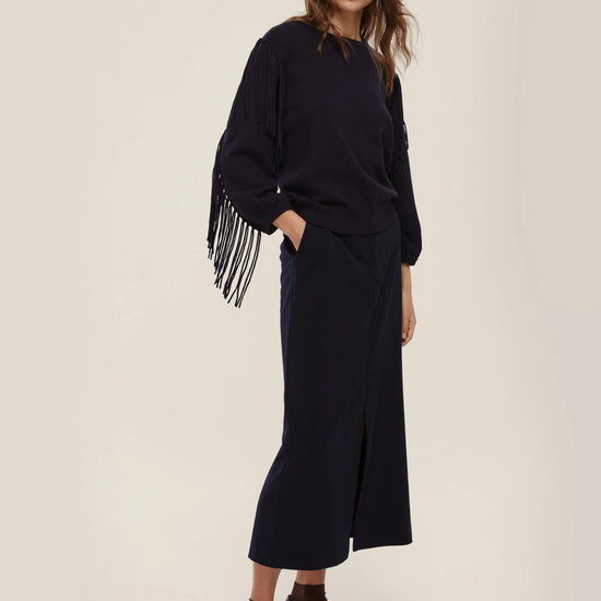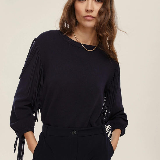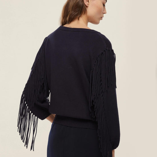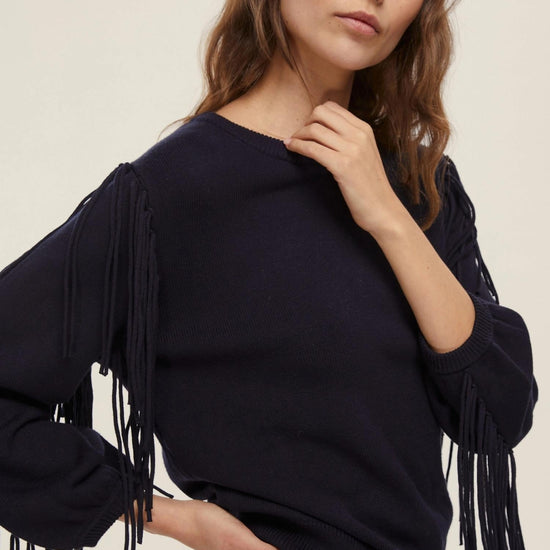 Se le frange sono il trend di stagione, questa è la maglia più cool. Ampia, con spalle scese e scollo a barchetta, si indossa con i denim o con una longuette per definire i look urbani che amerai di più. Tessuto principale contenente materie prime derivanti dalla cellulosa del legno, fibra ricavata nel rispetto del patrimonio forestale. Maglia in filato di misto viscosa stretch. Fit oversize con lunghezza in vita. Scollo a barchetta. Maniche a tre quarti. Motivo di frange lungo la manica e sulla spalla. Composizione e lavaggio: Lavare a mano acqua fredda max 40°; non candeggiare; non asciugare in tamburo; asciugare in piano in ombra; ferro tiepido max 120 gradi c; lavare a secco delicato con percloroetilene; non lavare ad umido professionale.; usare un panno tra capo e ferro.; usare detersivo neutro. 72% viscosa, 28% poliestere.