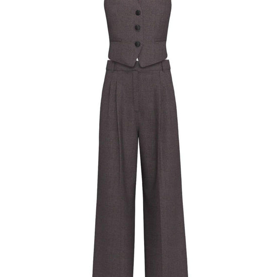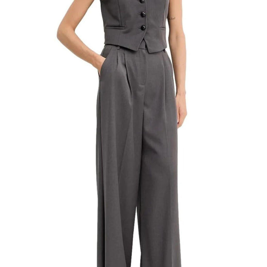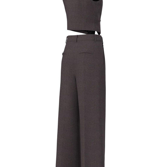 Gilet con scollo a V e chiusura monopetto, motivo di tagli a bretella sul davanti, pantalone a gamba larga