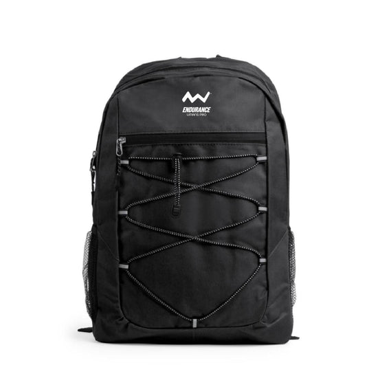 Zaino sportivo in poliestere 600D. Chiusura a zip nella tasca principale e in quella anteriore. Cordino elastico anteriore e tasche laterali in rete. Schienale e spallacci imbottiti. Logo ricamato.