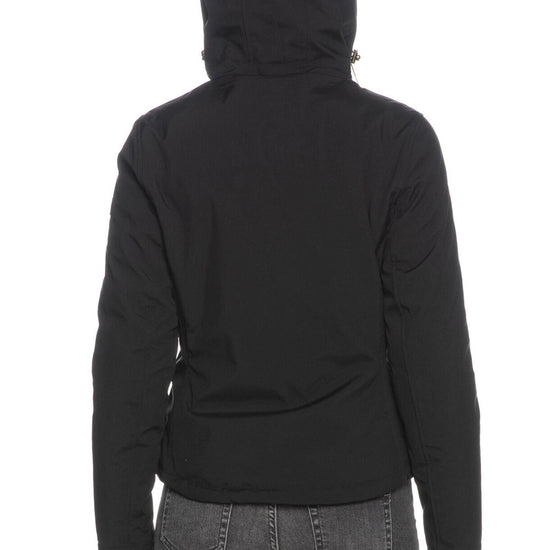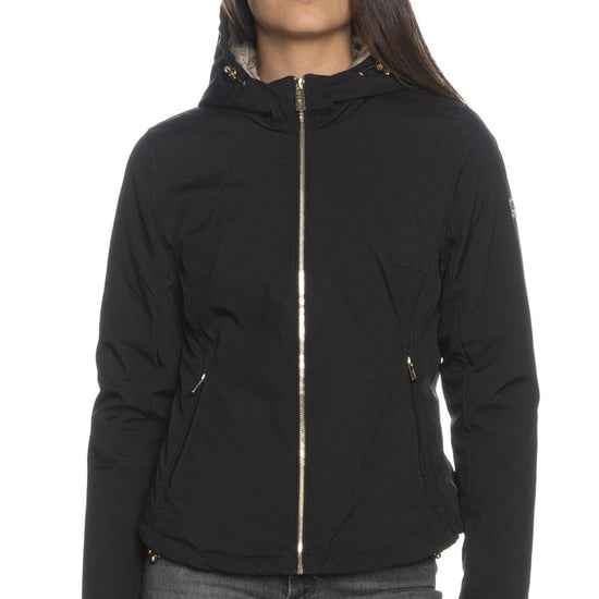 Giaccone Yes Zee Tech Hoodie da donna in tessuto Soft Shell di poliestere traspirante antivento e idrorepellente dalla finitura opaca, corto dalla linea leggermente sciancrata, con fodera in trapunta a contrasto colore e imbottitura sintetica, cappuccio fisso regolabile da stopper, chiusura centrale e tasche laterali a filo con zip a vista, fondo regolabile da stopper laterali interni e etichetta logo gommata patch sulla manica lunga.