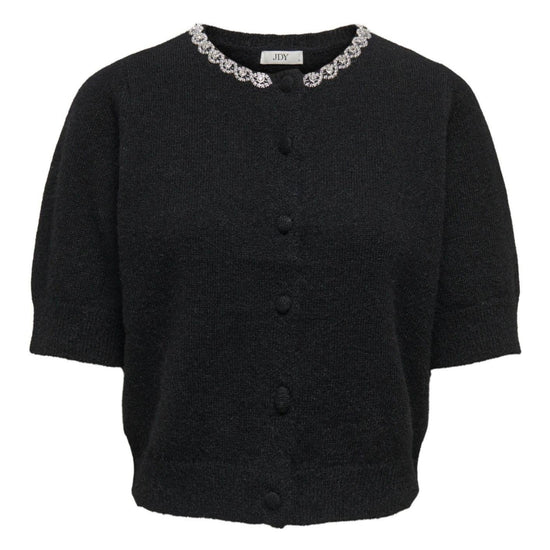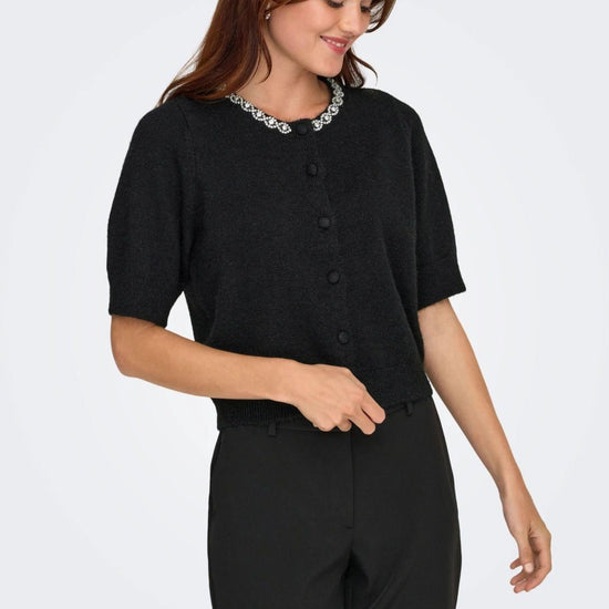 Cardigan paricollo, maniche 2/4 a sbuffo, polsini a coste, chiusura con bottoni, strass, knit fit