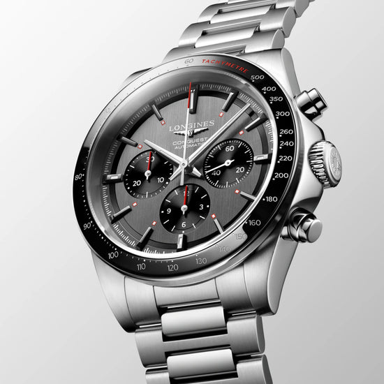 Il Conquest, l’orologio del quotidiano per eccellenza, è stato anche la prima collezione LONGINES ad avere il proprio nome protetto dall’Ufficio Federale Svizzero per la Proprietà Intellettuale nel 1954. Da allora, la collezione si è evoluta grazie al design e alla tecnologia, pur rimanendo fedele alla sua identità originaria, esprimendo un incontro armonioso di audacia, design contemporaneo ed eleganza sportiva. Ogni orologio Conquest Chronograph mette in mostra l’impegno costante di LONGINES per le prestazioni e l’eccellenza orologiera. Questi cronografi sono alimentati da un esclusivo calibro LONGINES dotato di un bilanciere-spirale in silicio.