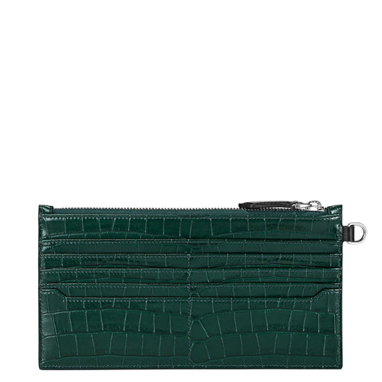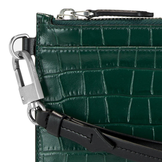 Funzionale e compatto, questo astuccio in pelle goffrata coccodrillo è progettato per contenere con stile gli oggetti quotidiani essenziali. È dotato di scomparti per otto carte di credito, due tasche aperte e uno scomparto con cerniera che può contenere un telefono cellulare. Si può portare all’interno di una borsa più grande o usare il cinturino da polso per uno stile più moderno.