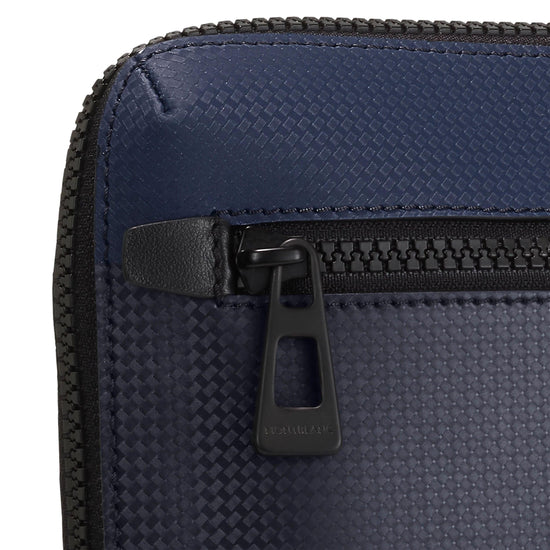 MATERIALE Vacchetta PELLE Pelle di vitello, concia al cromo, tintura passante, liscia e con stampa effetto fibra di carbonio CINTURINO Tracolla amovibile e regolabile senza logo COLORE Blu FODERA Fodera in cotone CHIUSURA Cerniera con due cursori