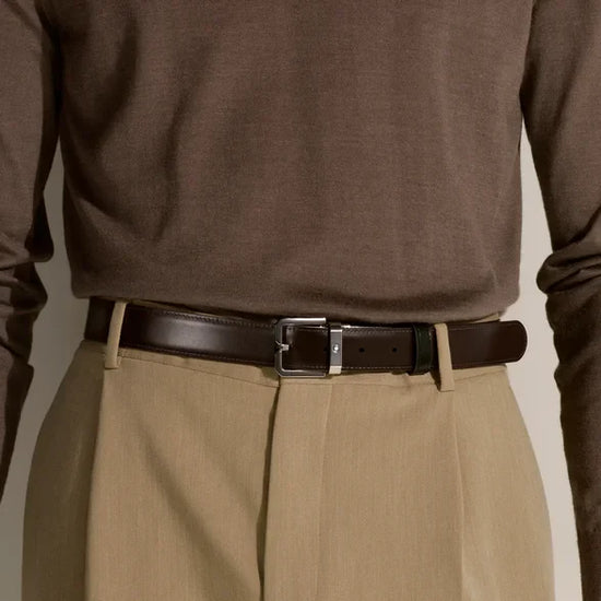 Aggiungi un tocco di raffinatezza a qualsiasi look con questa cintura caratterizzata da una cinghia reversibile da 3 cm x 120 cm in pelle nera e marrone. Il design è completato da una fibbia ad ardiglione rettangolare in acciaio con finitura palladio vintage.
