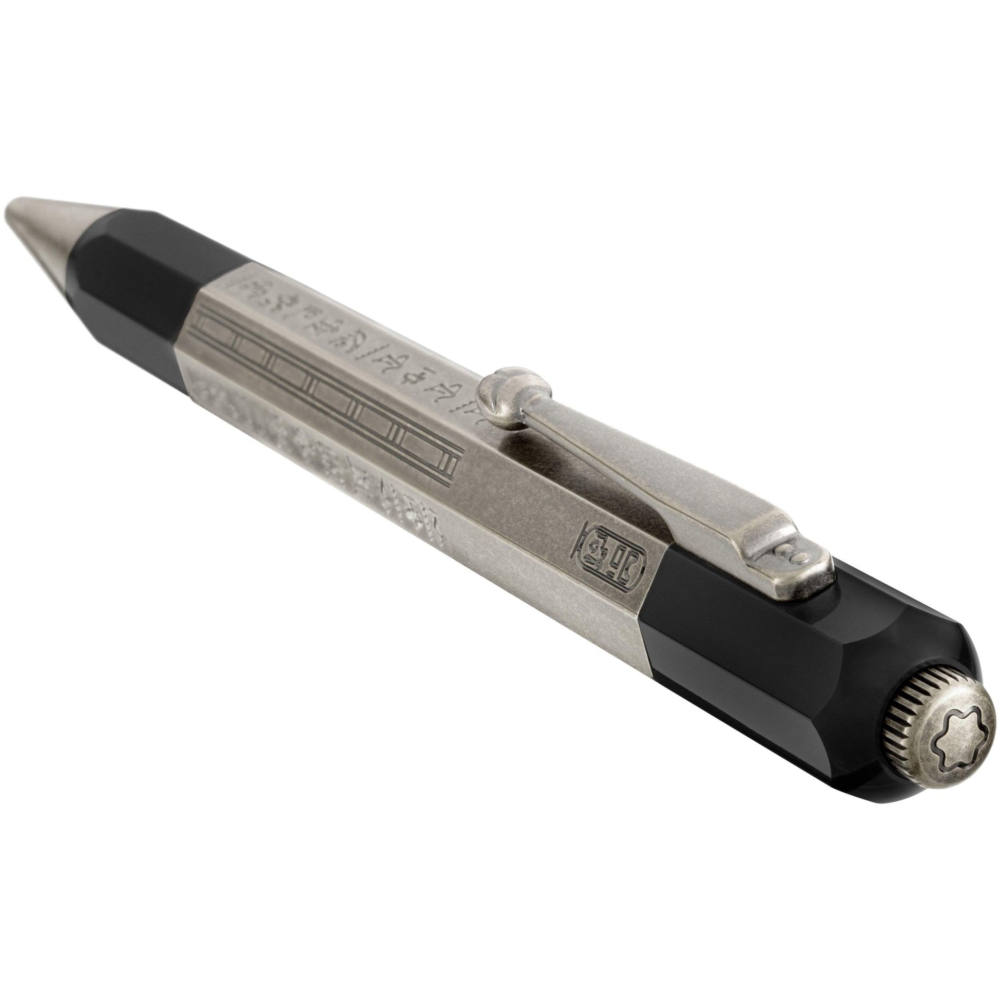 La collezione Heritage Egyptomania celebra lo spirito pionieristico di Montblanc. Nuova interpretazione dello strumento da scrittura, presenta una silhouette più lunga e affusolata e una maestria artigianale affinata nel tempo. Con la sua forma ottagonale, questo strumento da scrittura ricorda gli strumenti da scrittura della stessa forma creati da Montblanc negli anni 1920 e decorati con incisioni in stile egizio: le cosiddette “penne egiziane”. Realizzato in pregiata resina nera e metallo, è caratterizzato dalla scritta “Montblanc” in geroglifici egiziani sul corpo e da uno scarabeo sulla clip.