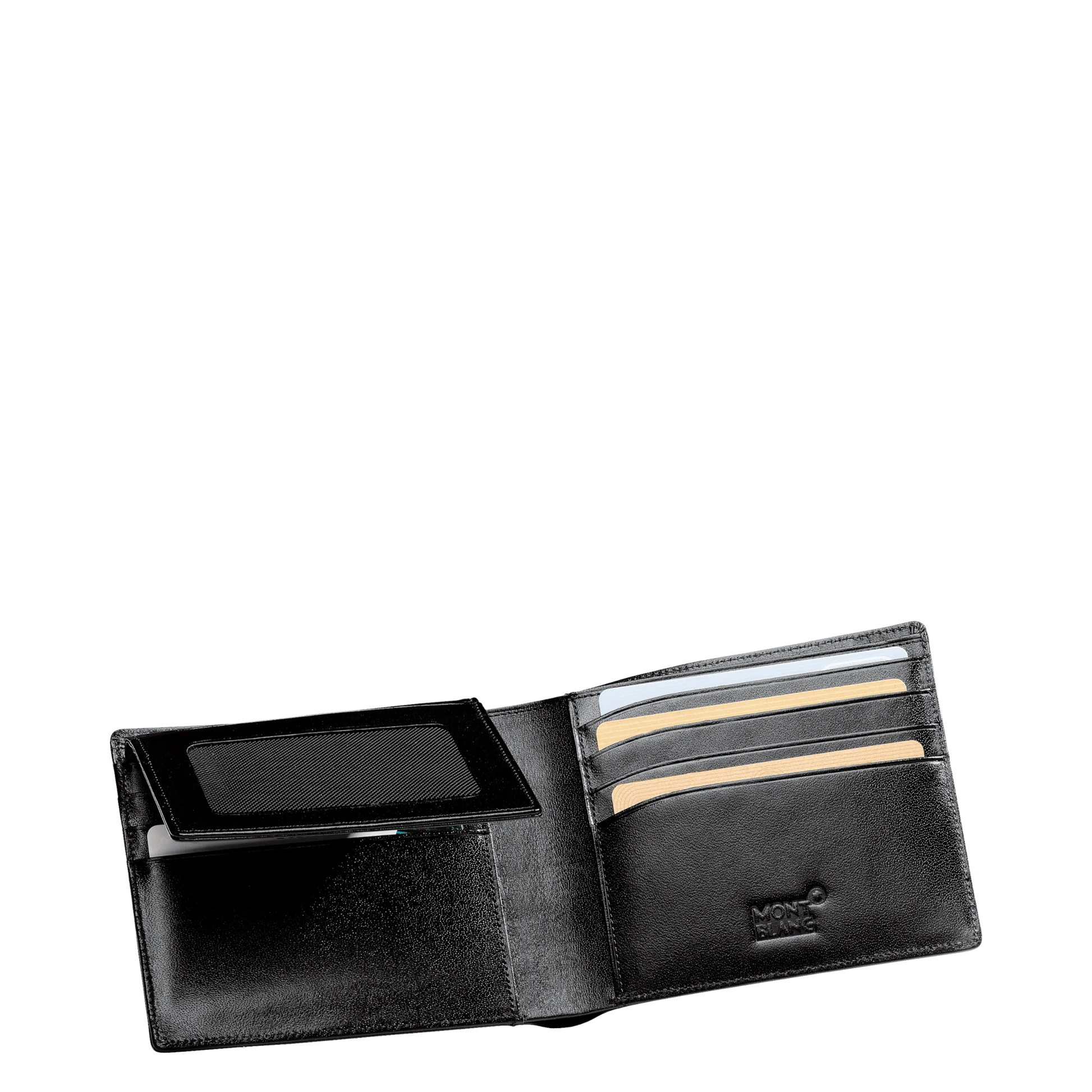Portafoglio 11 scomparti, in pelle di vitello pieno fiore europea, nero lucido esclusivo Montblanc, fodera jacquard con marchio Montblanc, emblema Mont-blanc con anello finitura palladio, tasca trasparente, 11 tasche per carte di credito, piccola tasca traspar-ente, scomparto per banconote, tasca extra.
