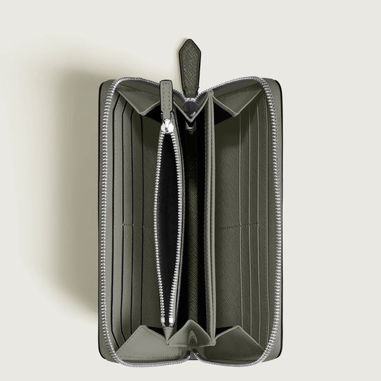 Questo portafoglio in pelle stampa Saffiano grigio medio è un accessorio versatile con numerosi dettagli funzionali. Oltre alle 12 aperture per carte di credito, presenta tre scomparti per banconote, un portamonete con cerniera e tre tasche aggiuntive per altri piccoli oggetti.