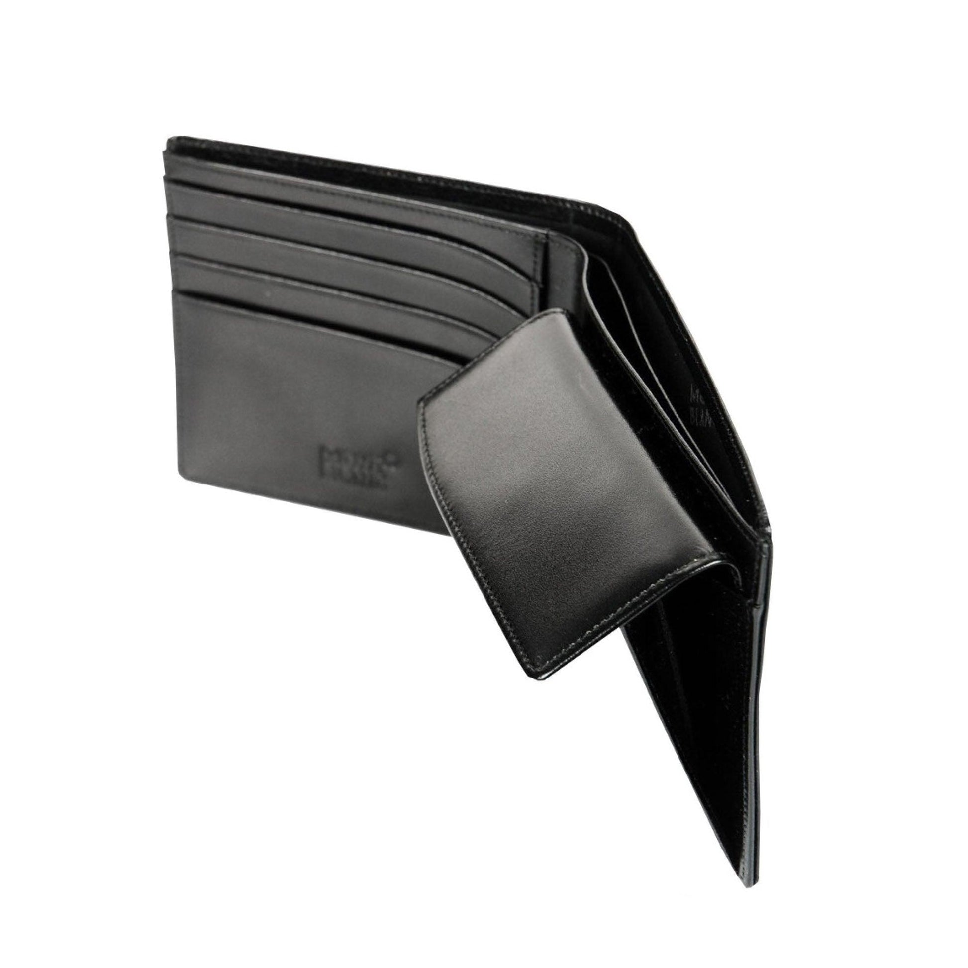 Portafoglio 4 scomparti, in pelle di vitello pieno fiore di provenienza europea, esclusivo effetto lucido Montblanc, fodera jacquard con marchio Montblanc, emblema Montblanc con anello finitura palladio, 4 tasche per carte di credito, 2 scomparti per banconote, portamonete con patta
