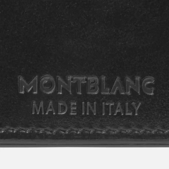 Portafoglio in pelle di vitello pieno fiore europea, nero lucido esclusivo Montblanc, fodera jacquard con marchio Montblanc, emblema Montblanc con anello finitura palladio, 10 tasche per carte di credito, 2 scomparti per banconote, portamonete con patta