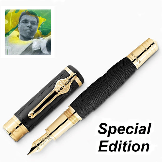 Solo pochi atleti vengono celebrati e onorati come Muhammad Ali, tre volte Campione del Mondo dei Pesi Massimi: le sue leggendarie gesta nel mondo dello sport e dell’attivismo per i diritti civili lo hanno reso uno degli atleti e degli operatori umanitari più influenti del XX secolo. Come atleta, Ali ha scosso il mondo intero con la sua forza, le sue capacità e la sua personalità, diventando Campione del Mondo dei Pesi Massimi all’età di soli 22 anni. I suoi più grandi trionfi, tuttavia, sono stati frutto del suo impegno umanitario. Realizzato in pregiata resina nera, il cappuccio riproduce la forma di un sacco da boxe, mentre il design del corpo ricrea le fasce da boxe indossate dai pugili per proteggere le mani. Il cappuccio presenta vari elementi decorativi, fra cui una celebre esclamazione di Ali, e una farfalla ispirata al suo tipico stile di combattimento: Volteggia come una farfalla, pungi come un’ape . Il cono a punta riprende proprio quest’ultimo concetto e reca incise quattro linee che rappresentano le corde del ring. Le iscrizioni sul cono si riferiscono alla vitoria di Ali ai Giochi Olimpici di Roma del 1960, e al primo campionato mondiale dei pesi massimi, che vinse a Miami nel 1964. L’anello del cappuccio presenta i dettagli della sua vittoria, ovvero il fatto di aver vinto al settimo round per KO tecnico. Per celebrare il suo primo titolo, l’emblema Montblanc in resina bianca è ornato dal numero 1 . Per enfatizzare il suo successo, la clip riproduce la forma di una cintura da campione di boxe con il suo nome. Il pennino in oro giallo massiccio Au585 lavorato a mano presenta un guantone da boxe.