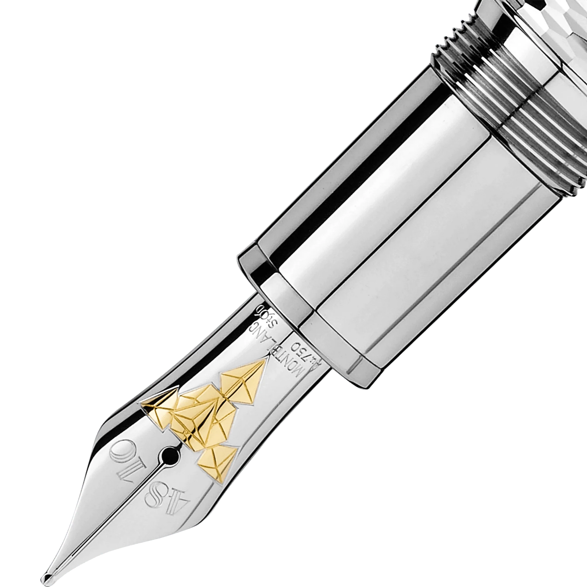 La Meisterstück Solitaire Geometric Dimension è nata dal desiderio di abbinare materiali esclusivi al classico design Montblanc. Lo strumento da scrittura, con il suo motivo geometrico tridimensionale e l'effetto ottico in sofisticata tonalità platino, ha un pennino finitura oro bicolore 18 K dal design esclusivo, una clip finitura platino e tre anelli finitura platino con goffratura del logo Montblanc. Completata dall'emblema Montblanc, crea uno stile unico e inimitabile.