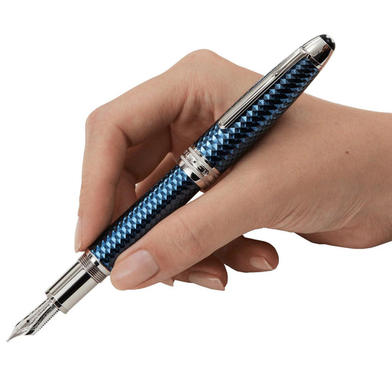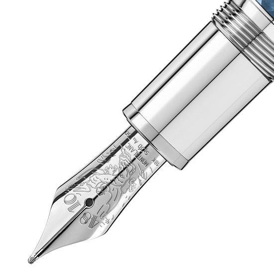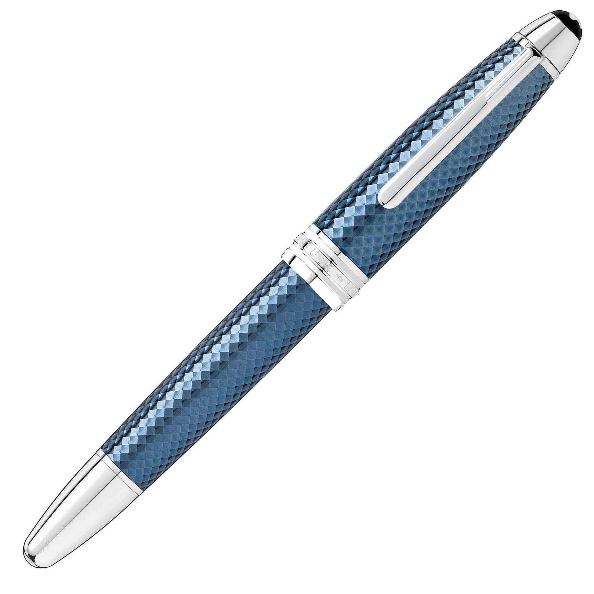 La stilografica Meisterstück Glacier Solitaire si ispira ai ghiacciai del Monte Bianco, simbolo della nostra dedizione alla qualità superiore e del nostro slancio verso l’esplorazione e lo spirito d’avventura. Completa questo strumento da scrittura il pennino in oro massiccio Au750 / 18K con finitura rodio, decorato da una riproduzione del ghiacciaio Mer de Glace, simile a un drago, che domina la cima del Monte Bianco. Il cappuccio e il corpo sono rivestiti da una lacca blu traslucida e presentano un’incisione dal motivo esclusivo che rievoca le rifrazioni geometriche dei cristalli di ghiaccio.