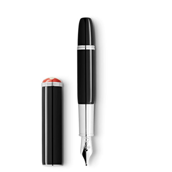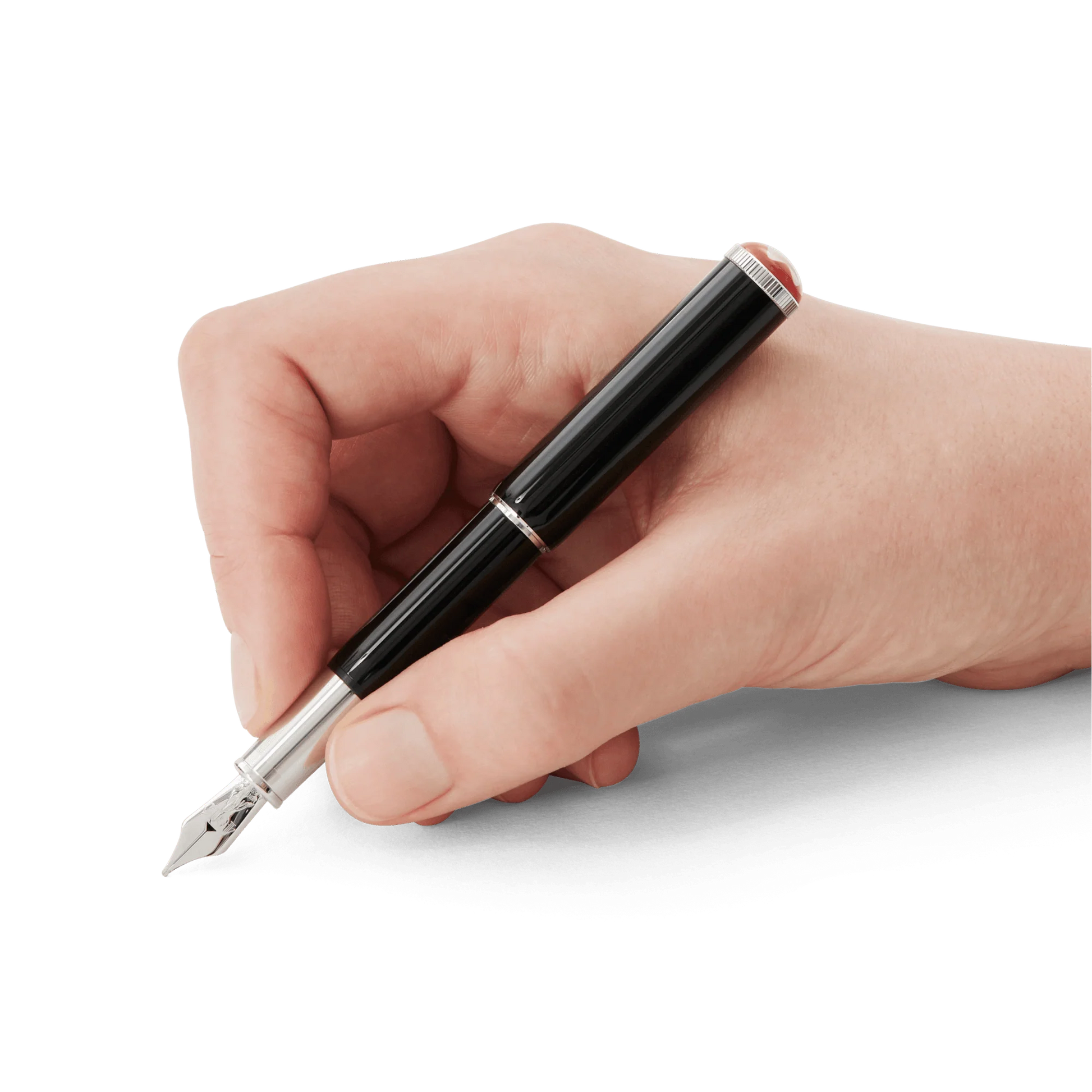 Montblanc Heritage Collection Rouge et Noir “Baby” celebra lo spirito pionieristico e la ricca tradizione della Maison. Ispirandosi alle penne “Baby” degli anni ’20, Montblanc reinterpreta in chiave moderna questo design rivoluzionario per l’epoca. Il nome è un riferimento scherzoso alle dimensioni ridotte di questo modello, rispetto agli altri strumenti da scrittura Montblanc. Creato in preziosa lacca nera con dettagli finitura platino, è coronato dall’emblema Montblanc in pregiata resina, circondato dall’iconica tonalità corallo della collezione Rouge et Noir. Il pennino in oro massiccio Au585 realizzato a mano presenta un disegno del Monte Bianco.
