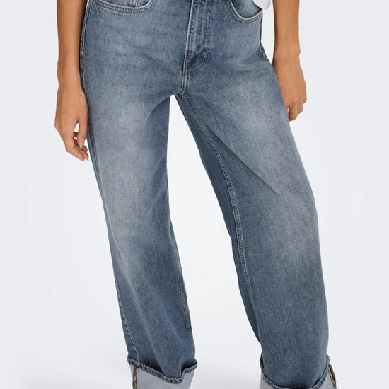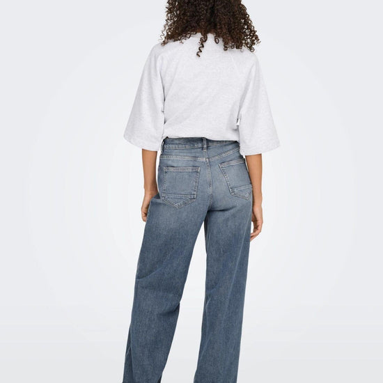 Jeans wide fit a vita alta con tasche frontali, tasche posteriori e coin pocket, dettagli con passanti per cintura e bordi con risvolto. Modello a gamba larga, comodo e ampio dai fianchi alla caviglia. Vestibilità wide fit. Composizione esterna: 98% cotone, 2% elastan.
