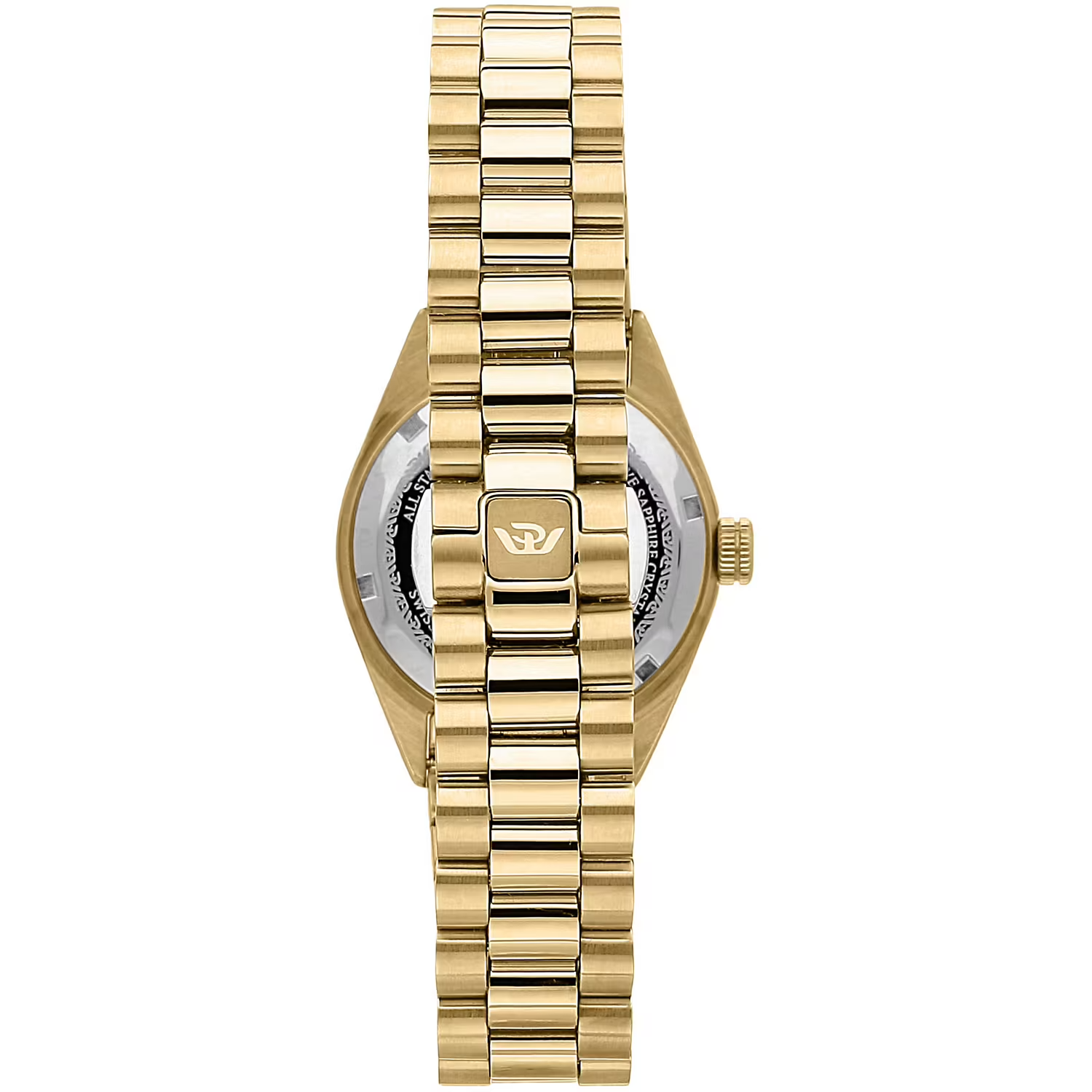 Un orologio che valorizza ogni look con eleganza e luce dorata, perfetto per ogni occasione, da un meeting di lavoro a una serata speciale.