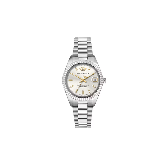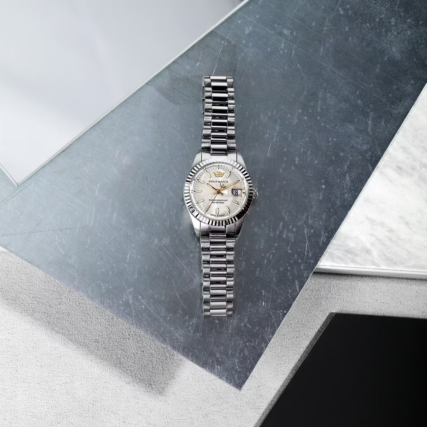 Il Philip Watch Caribe Urban Lady unisce il fascino della tradizione svizzera a un design moderno e compatto. Con una cassa rotonda da 28 mm in acciaio lucido e satinato color silver, questo orologio è perfetto per i polsi più sottili e per chi cerca uno stile sobrio ma distintivo. Il vetro zaffiro antiriflesso garantisce massima leggibilità, mentre il bracciale in metallo silver con chiusura a farfalla assicura comfort e sicurezza.