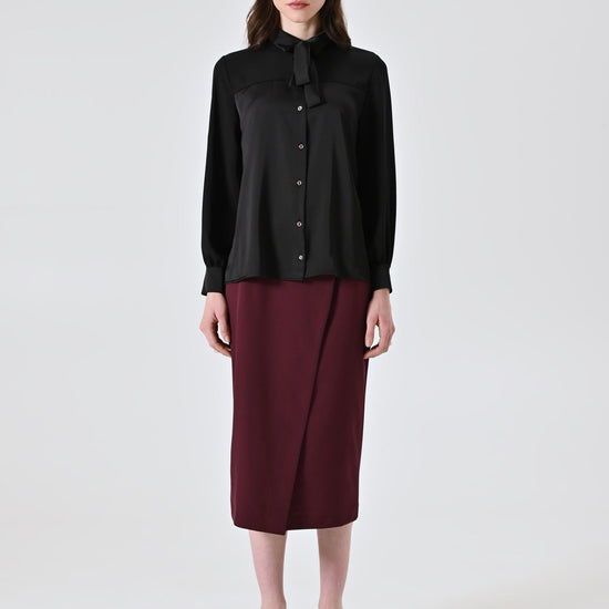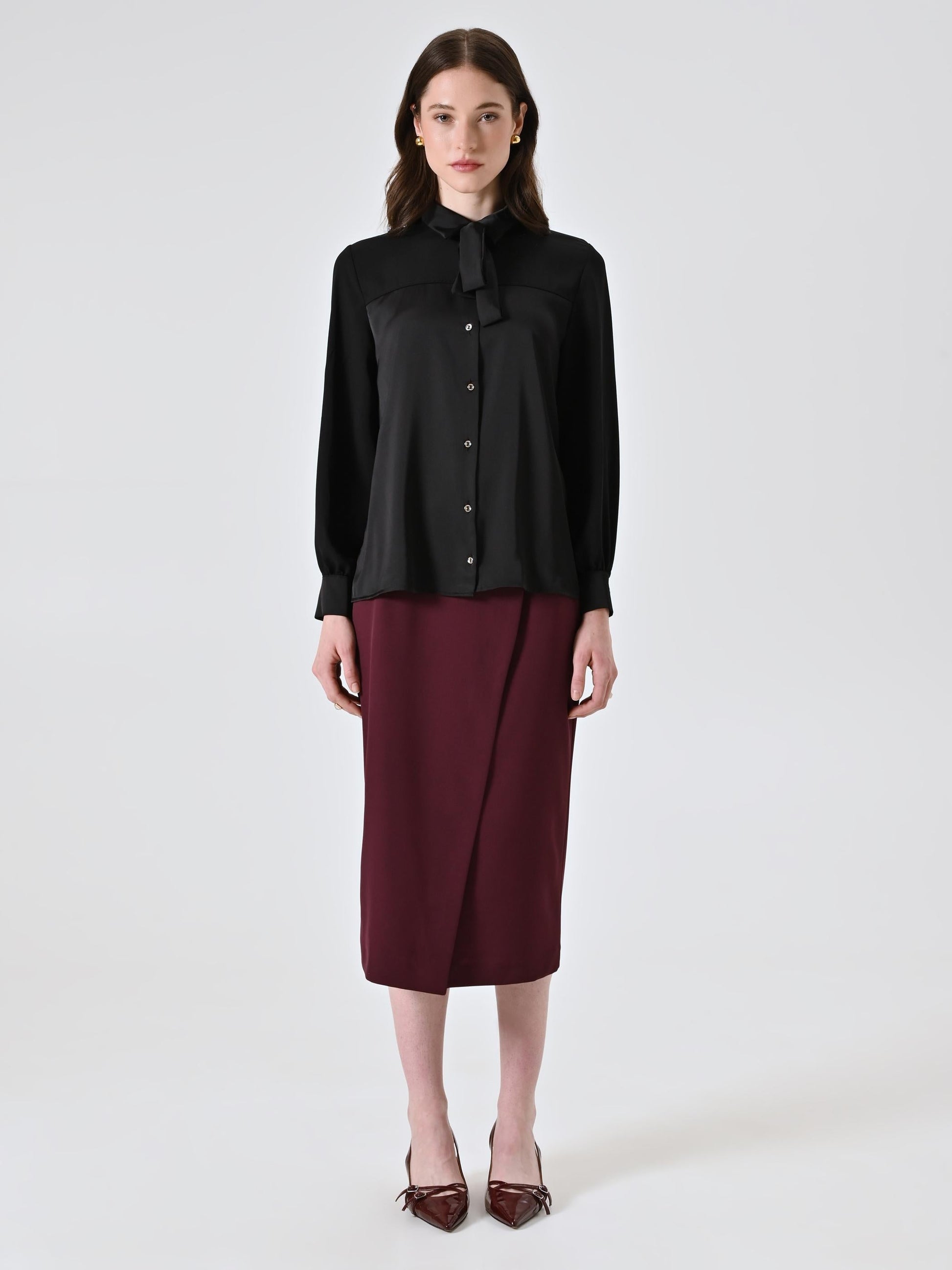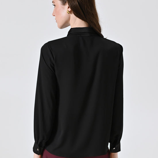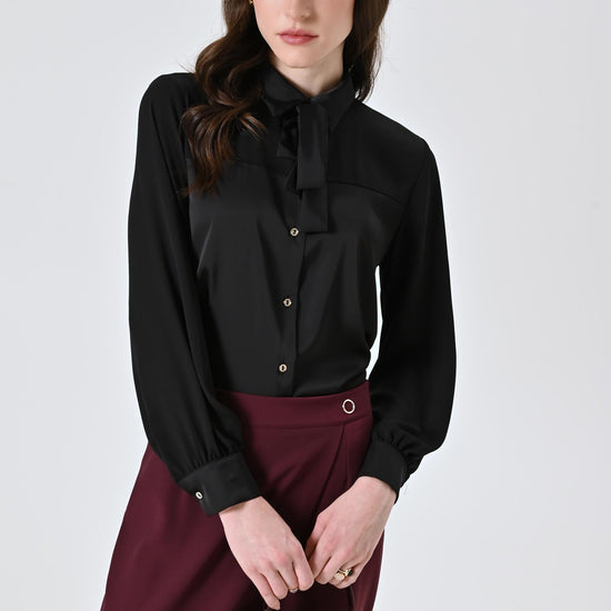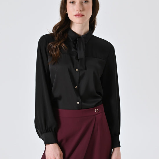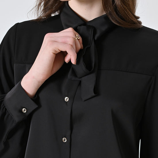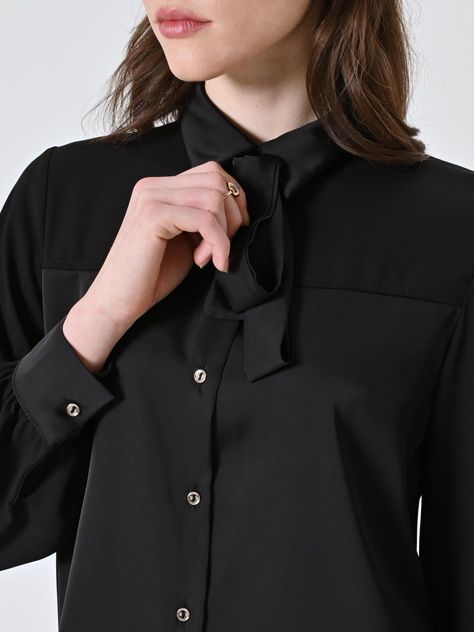 La Camicia con Fiocco Removibile è realizzata in crepe georgette, con dettagli in raso su colletto e polsini e un nastro in raso removibile da annodare come fiocco o indossare come cravattino, per una vestibilità morbida e versatile. La chiusura con bottoncini piatti dorati completa il design con una nota luminosa.